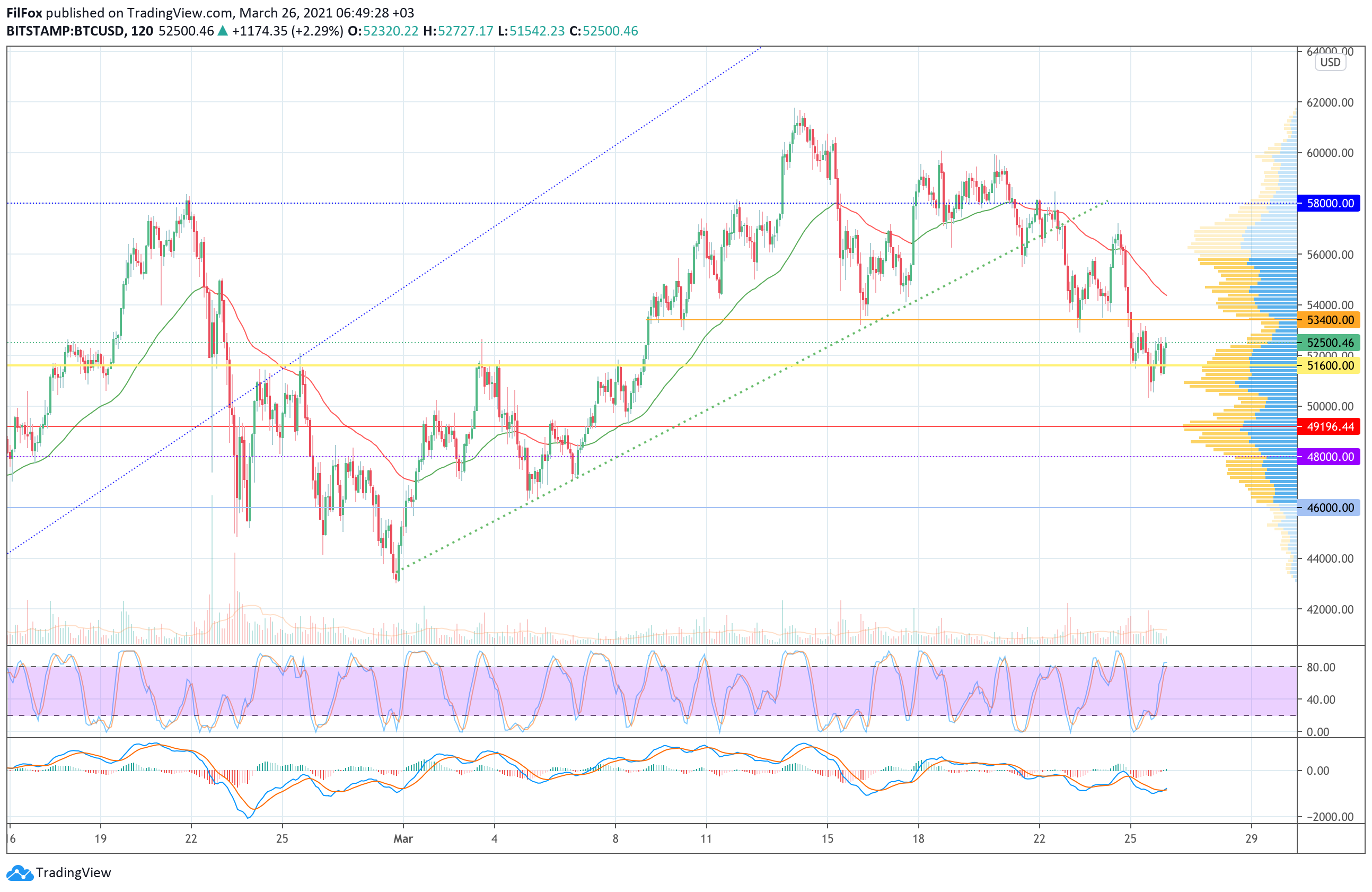 Вчера в первой половине дня покупатели попытались перехватить инициативу и на мелких объёмах восстановили цену BTC к оранжевому уровню 53400.00 USD.