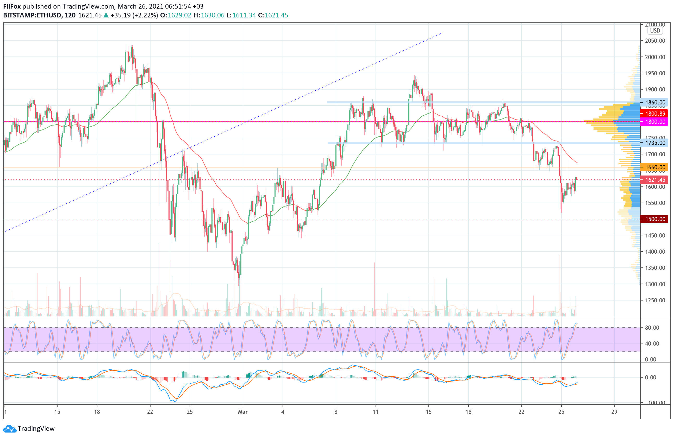 Вчера утром цена ETH закрепилась в районе 1570.00 USD, а днём продолжила восстановление к уровню 1600.00 USD. Сегодня ночью покупателям удалось преодолеть этот уровень сопротивления, но восстановление к сопротивлению 1660.00 USD пока под вопросом.
