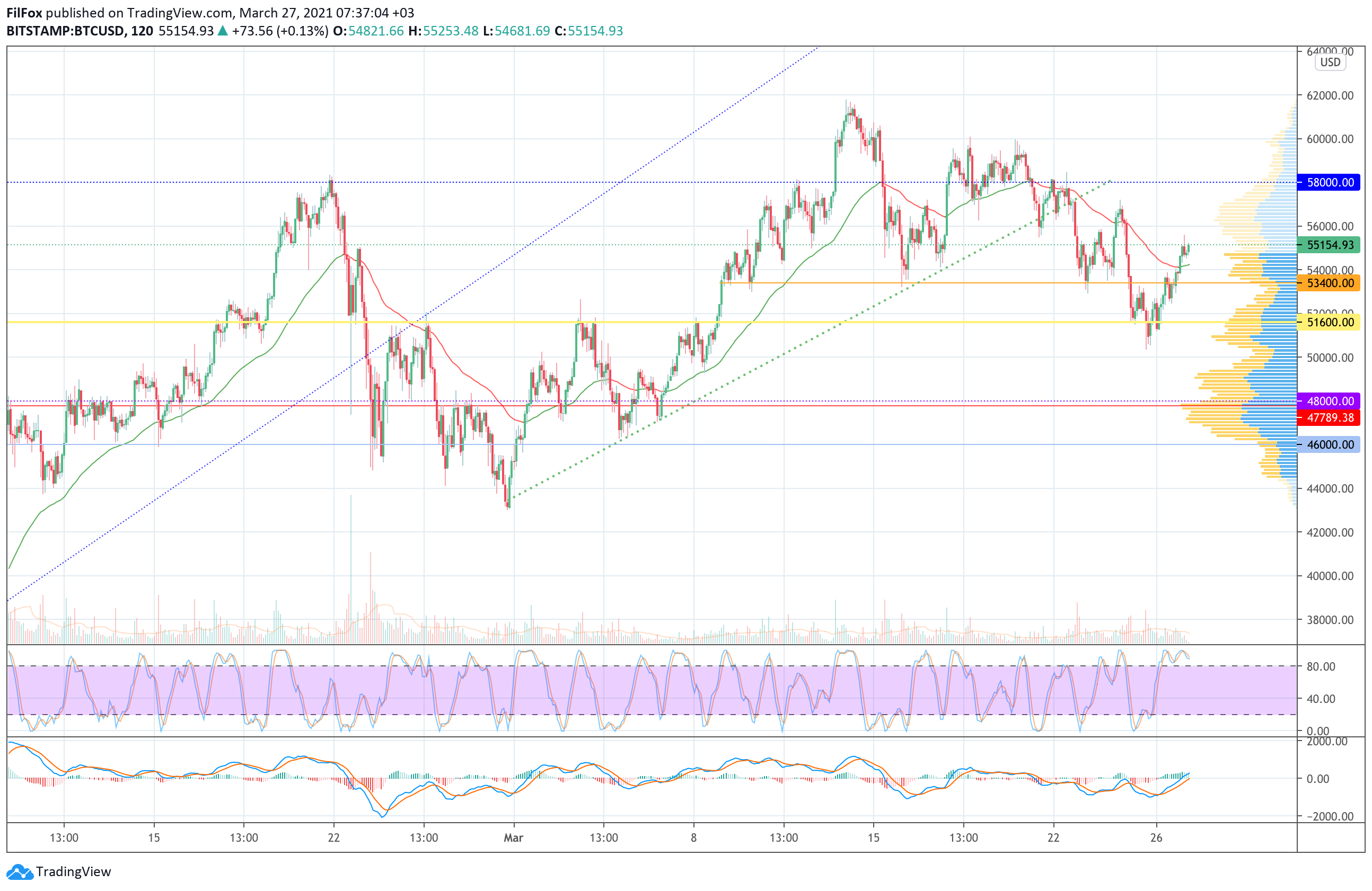 Ночью объёмы покупок сократились, однако покупателям, на снижающихся объёмах, удалось обозначить локальный максимум в районе отметки 55600.00 USD.