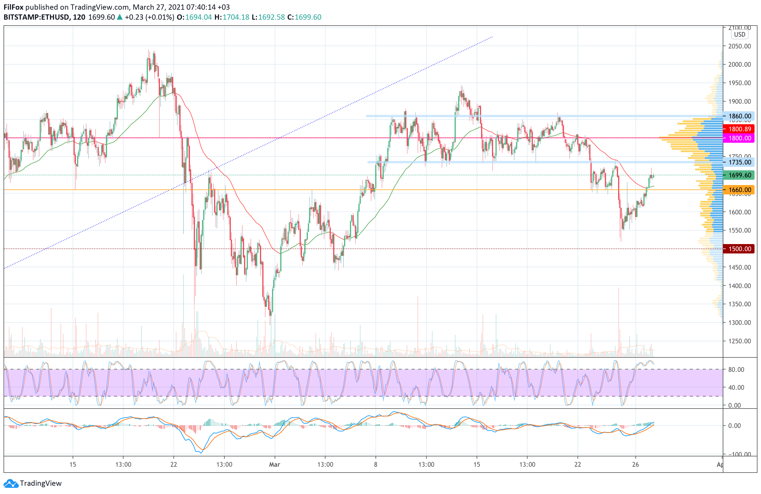 Сегодня ночью рост продолжился и пара обозначила локальный максимум в районе отметки 1720.00 USD. Если покупатели смогут продолжить позитивную динамику пары, то цена эфира может вернуться в широкий голубой коридор.