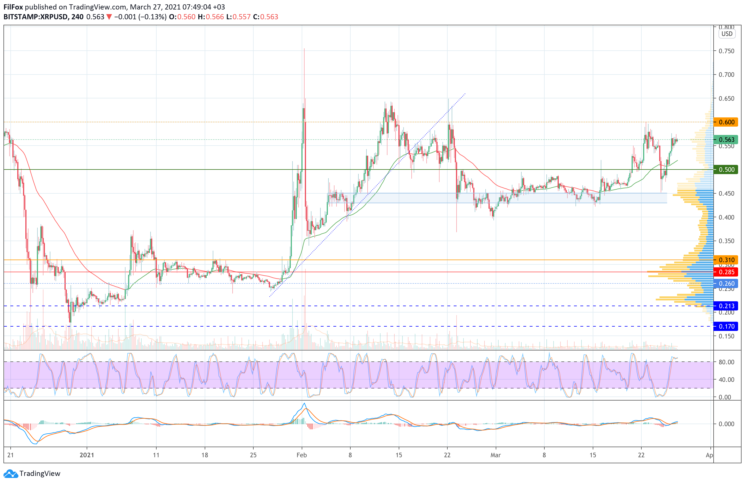 Вчера покупатели попытались поддержать позитивную динамику цены XRP, сформировав слабый бычий импульс. Пара установила дневной максимум в точке 0.577 USD, но до конца дня не смогла продолжить восстановление к сопротивлению 0.600 USD.