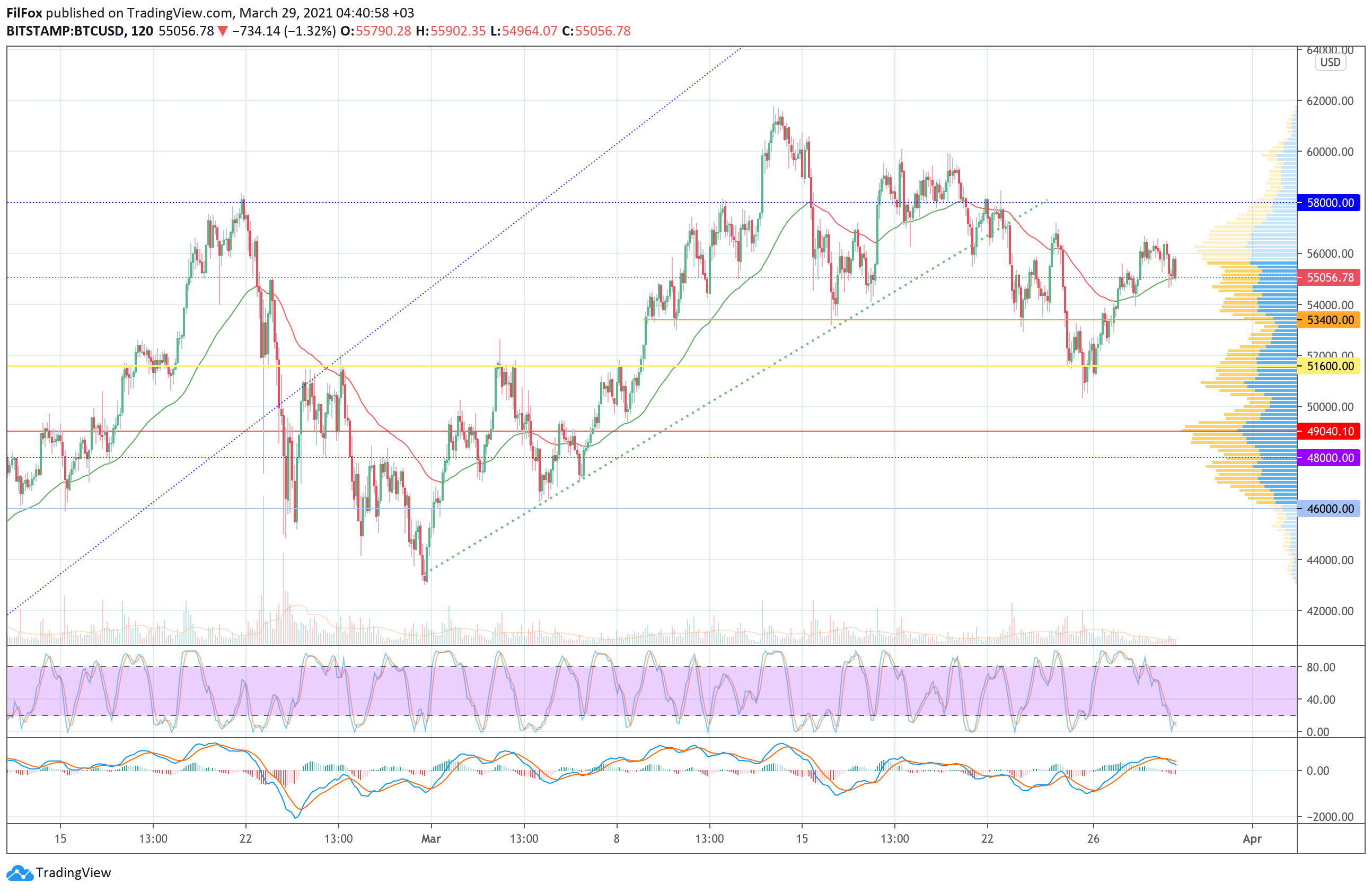 Если же медведи продавят поддержку двухчасовой скользящей средней, то цена откатится к оранжевому уровню 53400.00 USD.