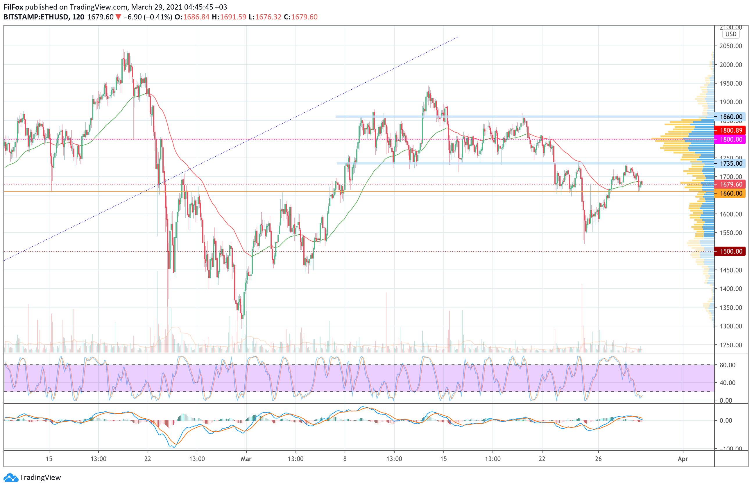 Несмотря на низкие субботние объёмы торгов, цена Ethereum смогла продолжить восстановление к нижней границе широкого голубого коридора. В ночь на воскресенье пара протестировала сопротивление 1735.00 USD и откатилась в область средних цен.