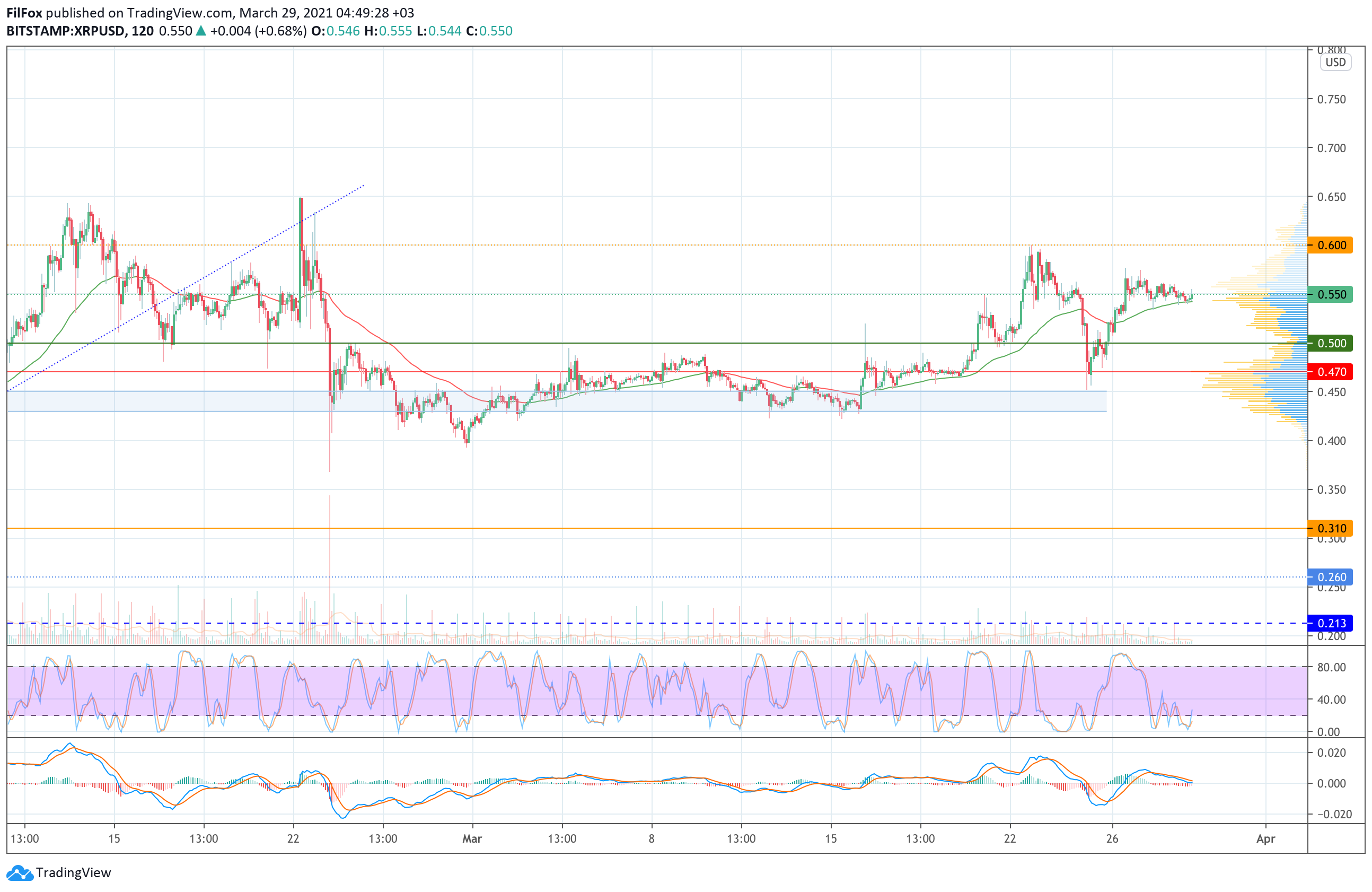 На прошедших выходных цена XRP не смогла продолжить восстановление и двигалась, преимущественно, в боковом направлении, используя поддержку двухчасовой скользящей средней EMA55.