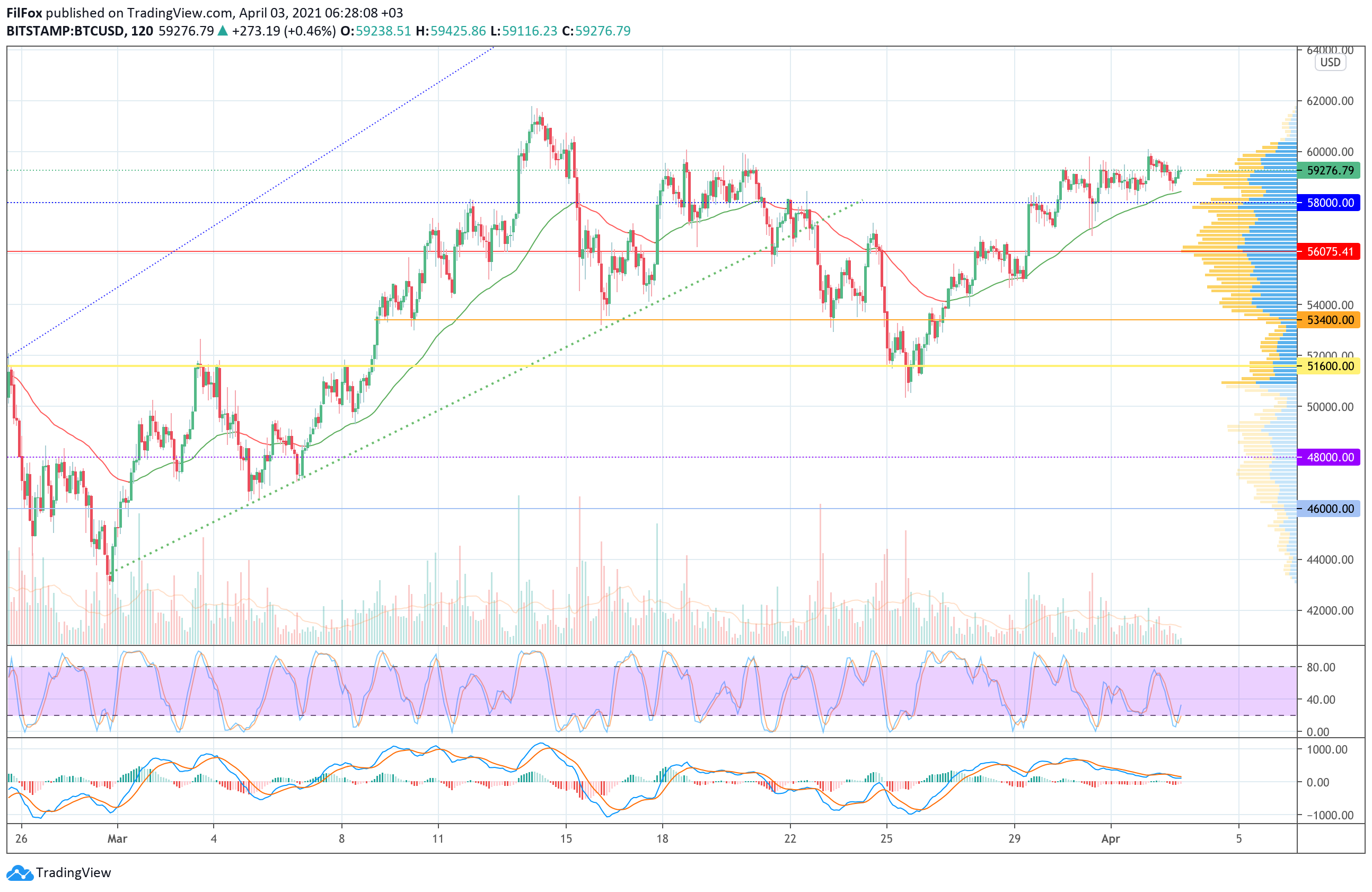 Вчера утром объёмы торгов были низкие, и цена биткоина не смогла закрепиться выше сопротивления 60000.00 USD. В течение дня цена плавно снижалась, а поздно вечером протестировала двухчасовую EMA55.