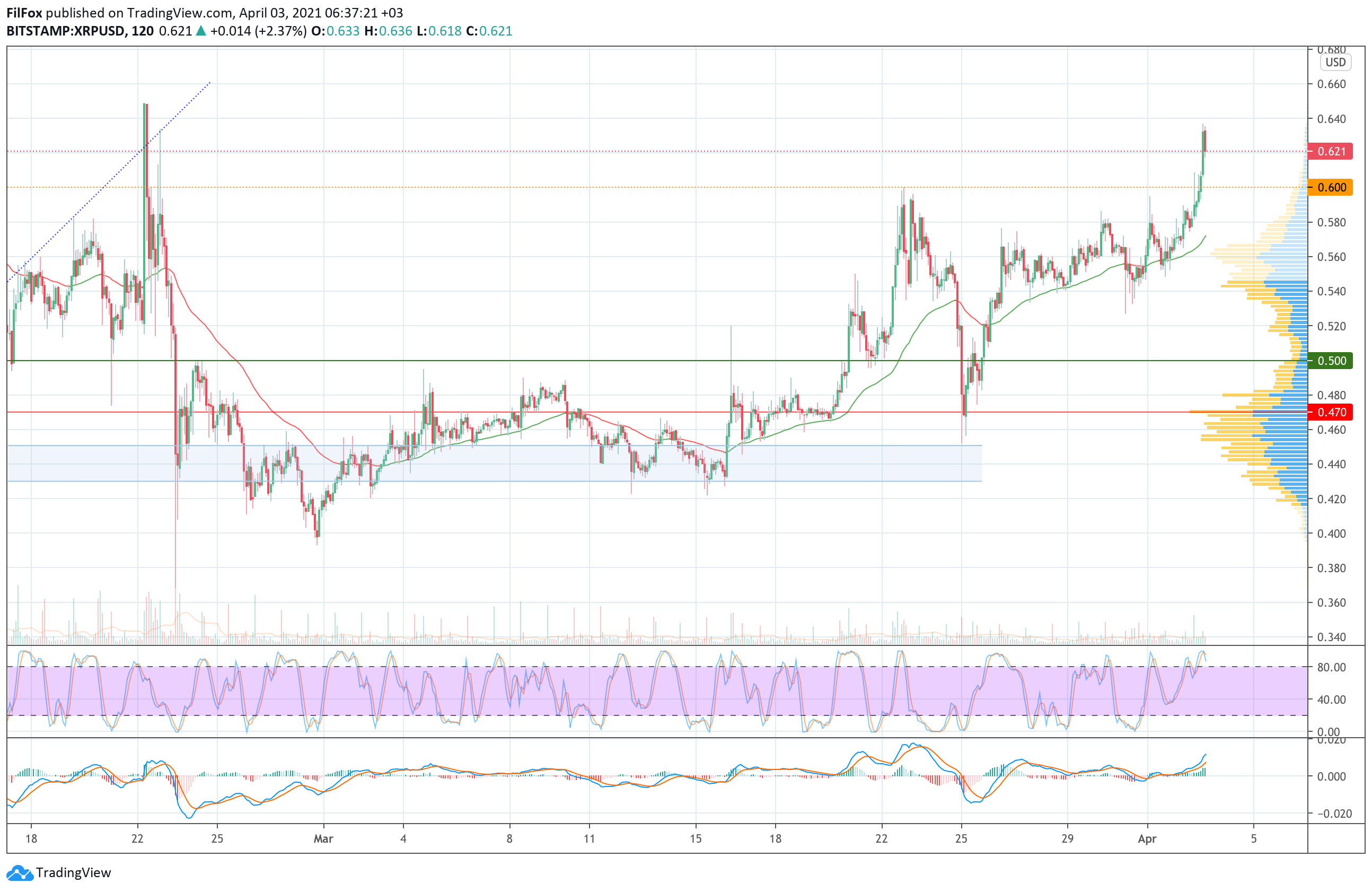 Согласно нашим вчерашним прогнозам, пара XRP/USD всё-таки смогла проколоть сопротивления 0.600 USD, а минувшей ночью быки установили апрельский максимум в точке 0.637 USD.