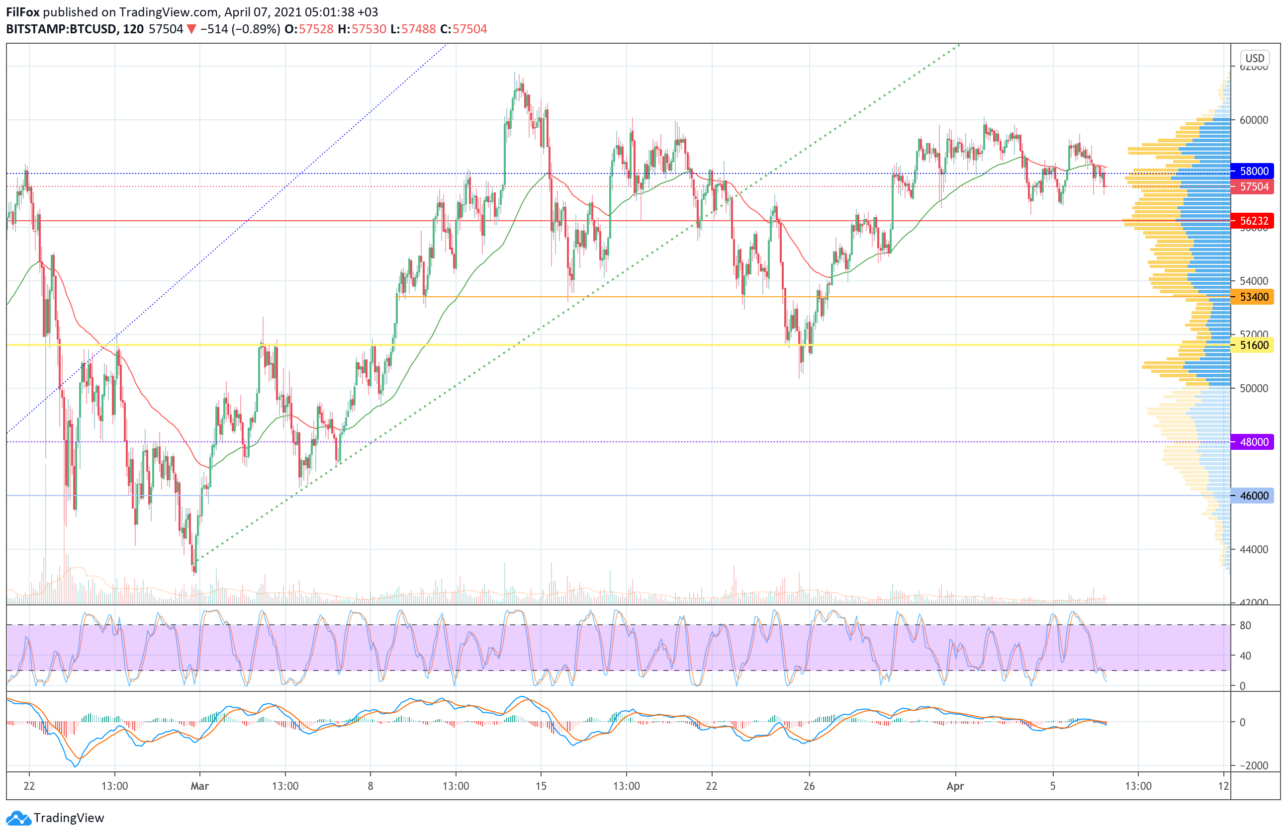 Вчера в первой половине дня цена BTC откатилась к поддержке 58000.00 USD. Этот уровень приостановил снижение, но давление медведей не прекращалось.