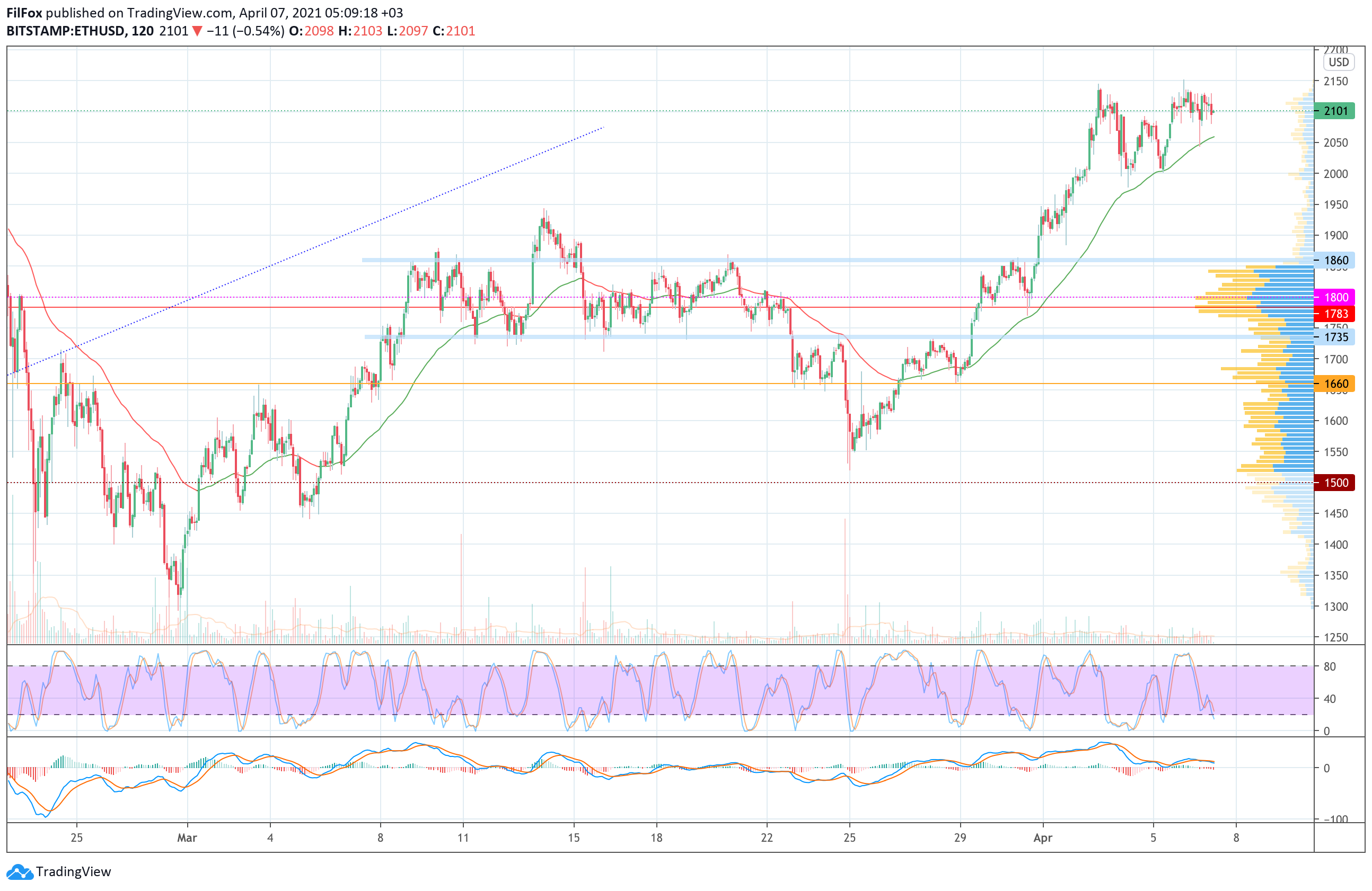 Вчера утром объёмы торгов сократились и цена Ethereum не смогла продолжить рост к новому историческому максимуму. В течение дня пара консолидировалась в боковом диапазоне, воспользовавшись поддержкой на уровне 2100.00 USD.