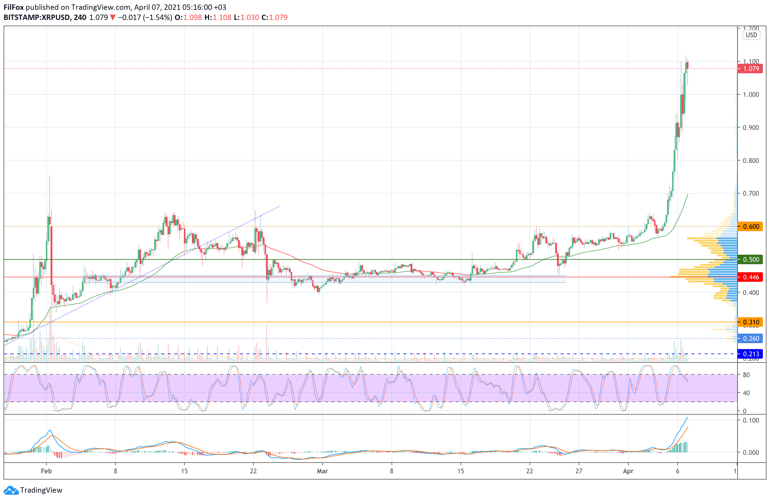 Цена XRP достигла трёхлетнего максимума в районе отметки 1.118 USD и в ближайшее время намерена продолжить рост, который с начала апреля составил уже более 100%.