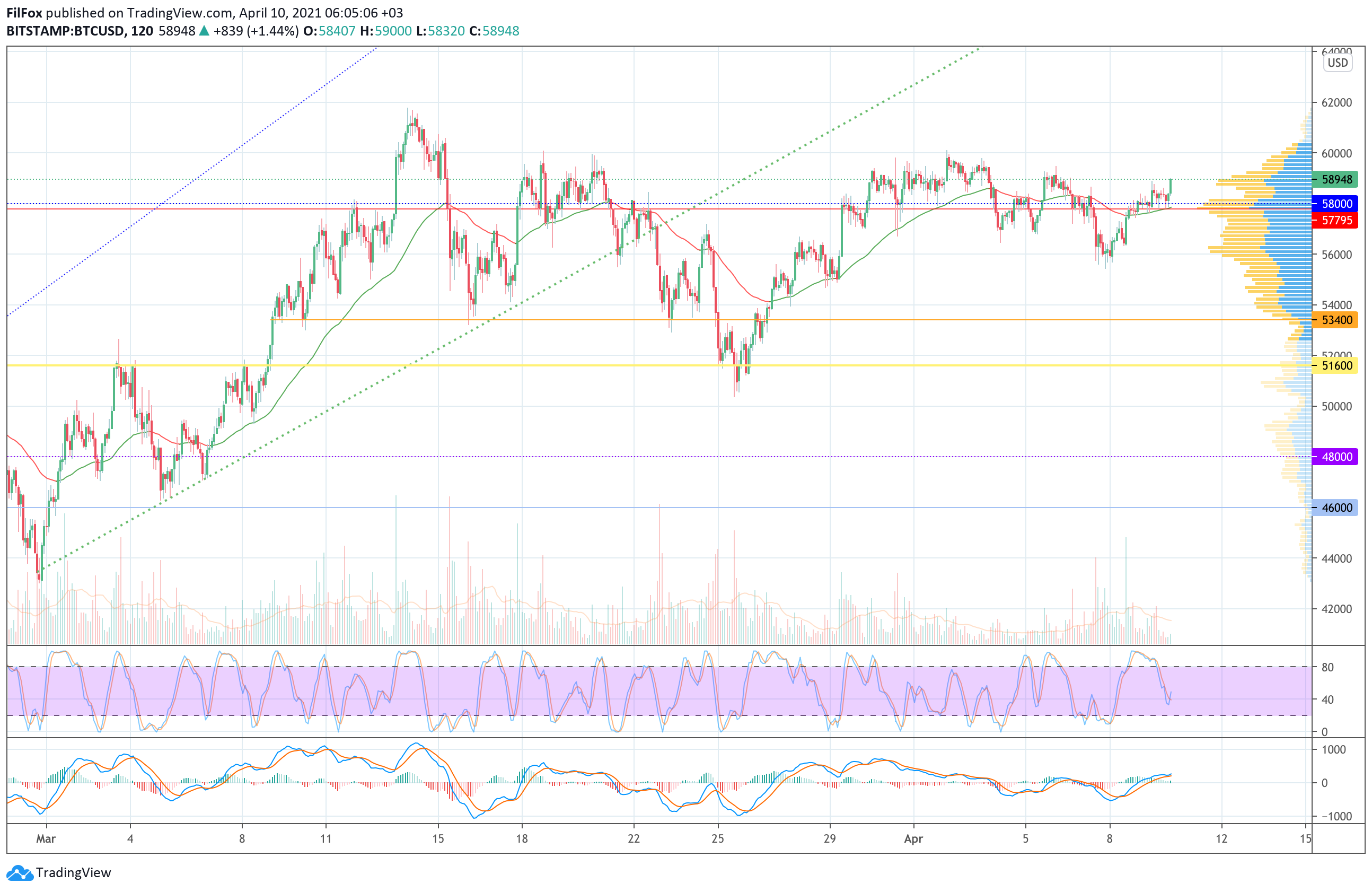 Вчера покупатели смогли продолжить рост в область 59000.00 USD. Сегодня утром был установлен локальный максимум в районе отметки 59103.00 USD. В первой половине дня рост продолжится и в ближайшее время пара восстановится к сопротивлению 60000.00 USD.