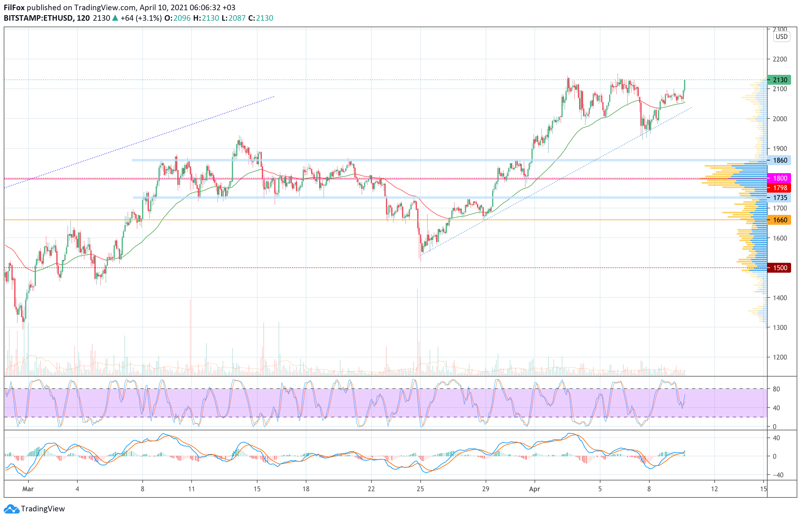 Сегодня ночью покупателям удалось сформировать средний по силе бычий импульс и пробить сопротивление 2100.00 USD. На утро пара установила локальный максимум в точке 2145.00 USD. В течение дня следует ожидать продолжение роста. До конца этой недели цена обновит абсолютный максимум в районе отметки 2170.00 USD, а в начале следующей недели быки могут дотянуться до уровня 2200.00 USD.