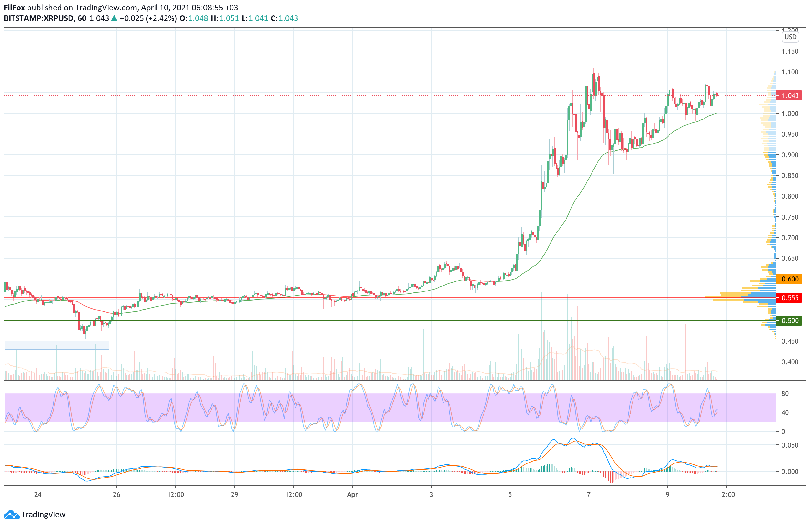 До завершения дня пара восстановилась в зону апрельских максимумов. Цена XRP вплотную подошла к сопротивлению 1.100 USD и сегодня следует ожидать прорыв к новым годовым максимумам в районе отметки 1.200 USD.