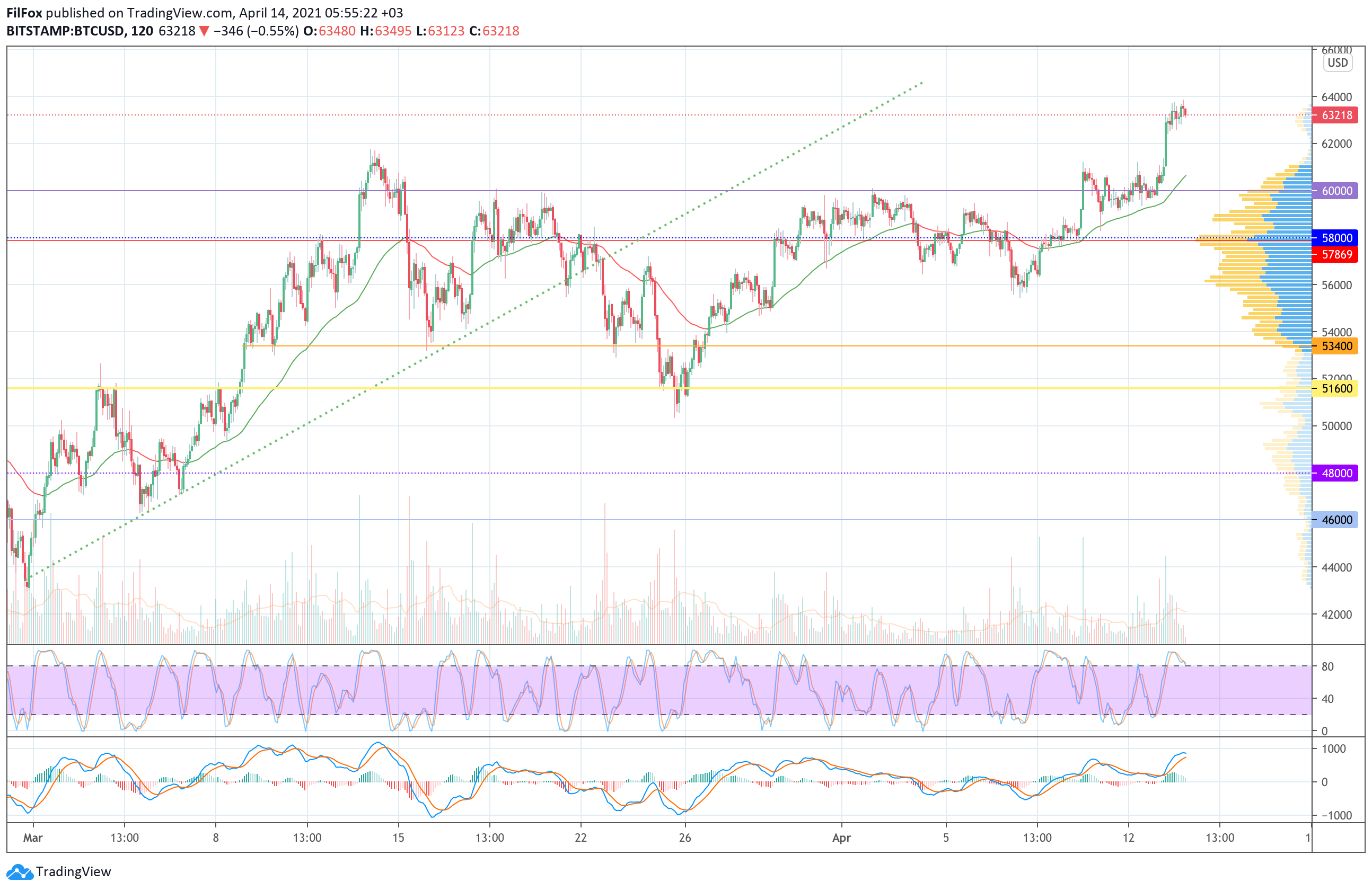 Вчера утром покупатели смогли прорваться в зону абсолютного максимума и в первой половине дня продолжили рост цены биткоина. Мощный бычий импульс легко преодолел намеченный нами уровень 62200.00 USD, а абсолютный ценовой рекорд зафиксирован сегодня ночью в точке 63860.00 USD.