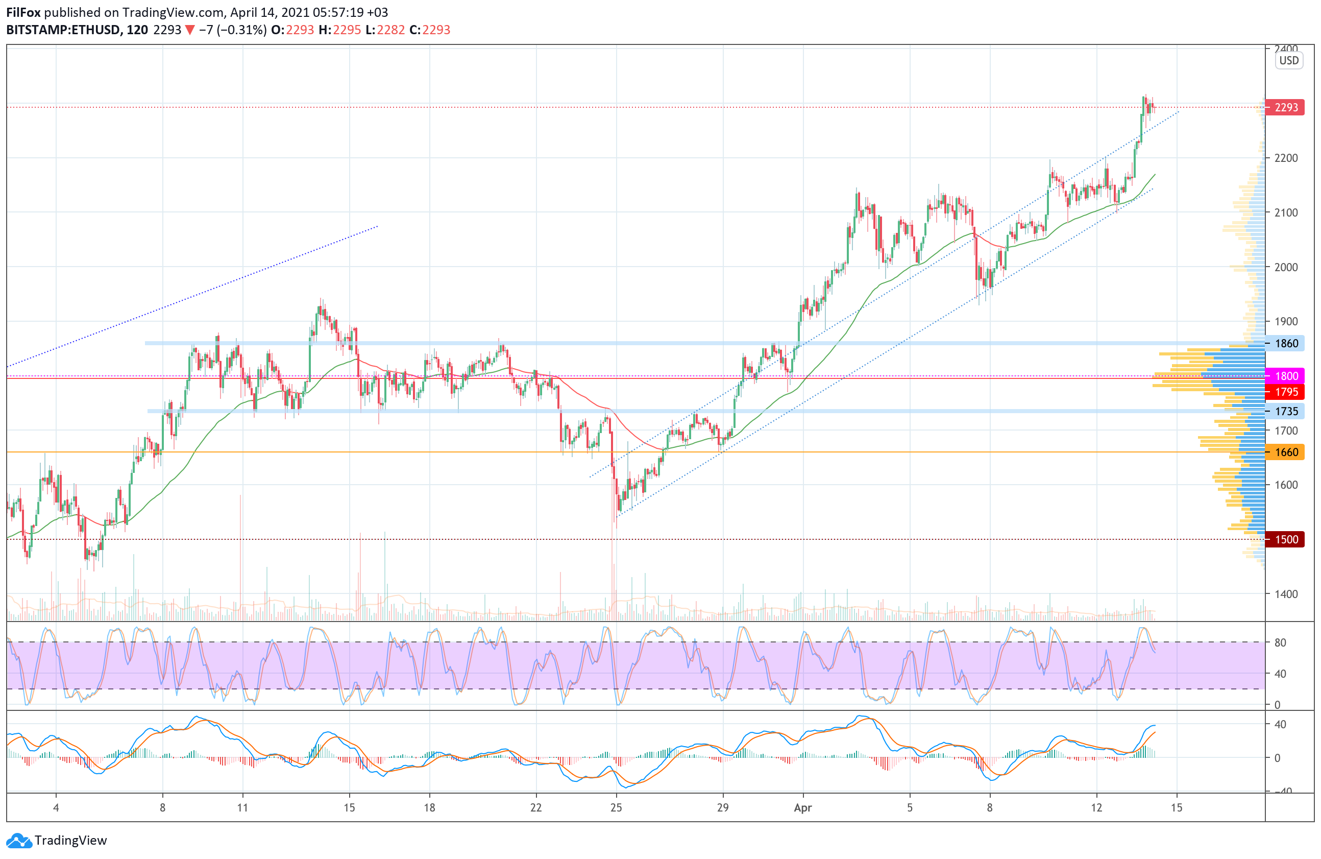 Сегодняшний рост пока не поддержан крупными объёмами, и судя по индикаторам Stoch RSI рынок достиг зоны перекупленности. Поэтому после обновления абсолютного максимума цена Ethereum откатится к верхней линии тренда.