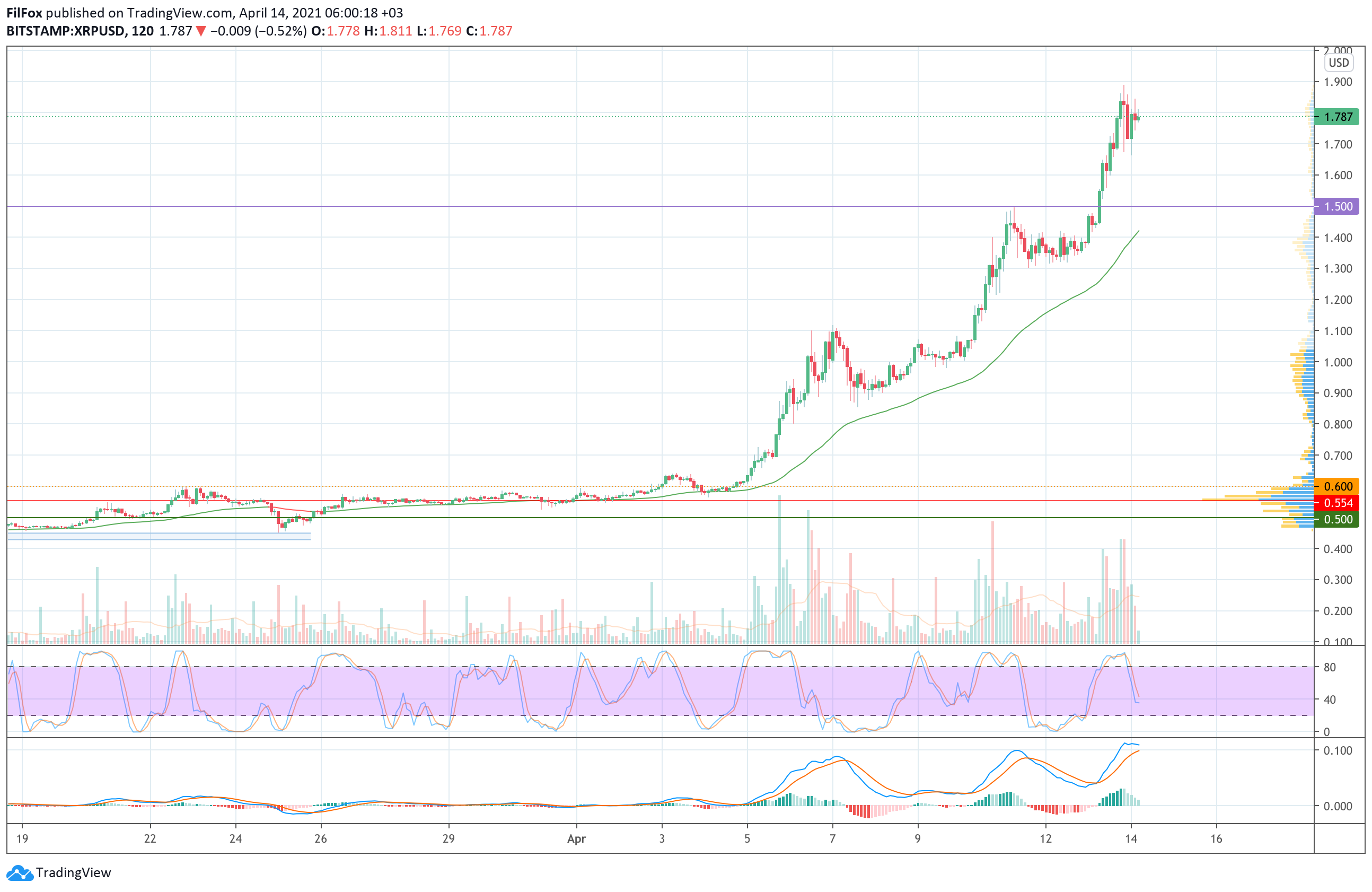 Вчера утром быки пробили сопротивление 1.500 USD и вытащили цену XRP из краткосрочного боковика. Покупателям удалось сформировать достаточно сильный бычий импульс, который преодолел отметку 1.600 USD и установил дневной максимум в точке 1.890 USD.