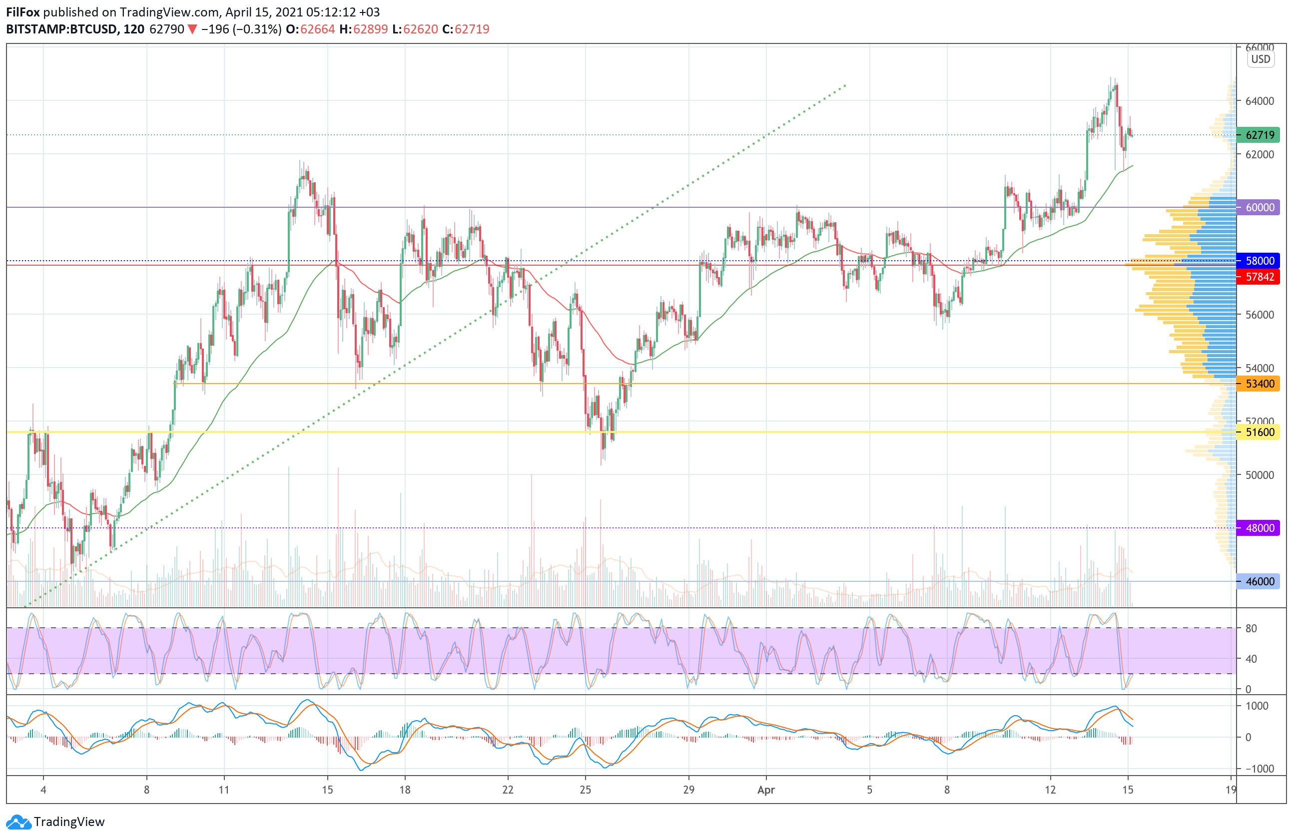 Несмотря на перекупленность рынка, вчера утром рост продолжился на снижающихся объёмах, и цена биткоина обновила абсолютный максимум, установив его в точке 64896.75 USD.