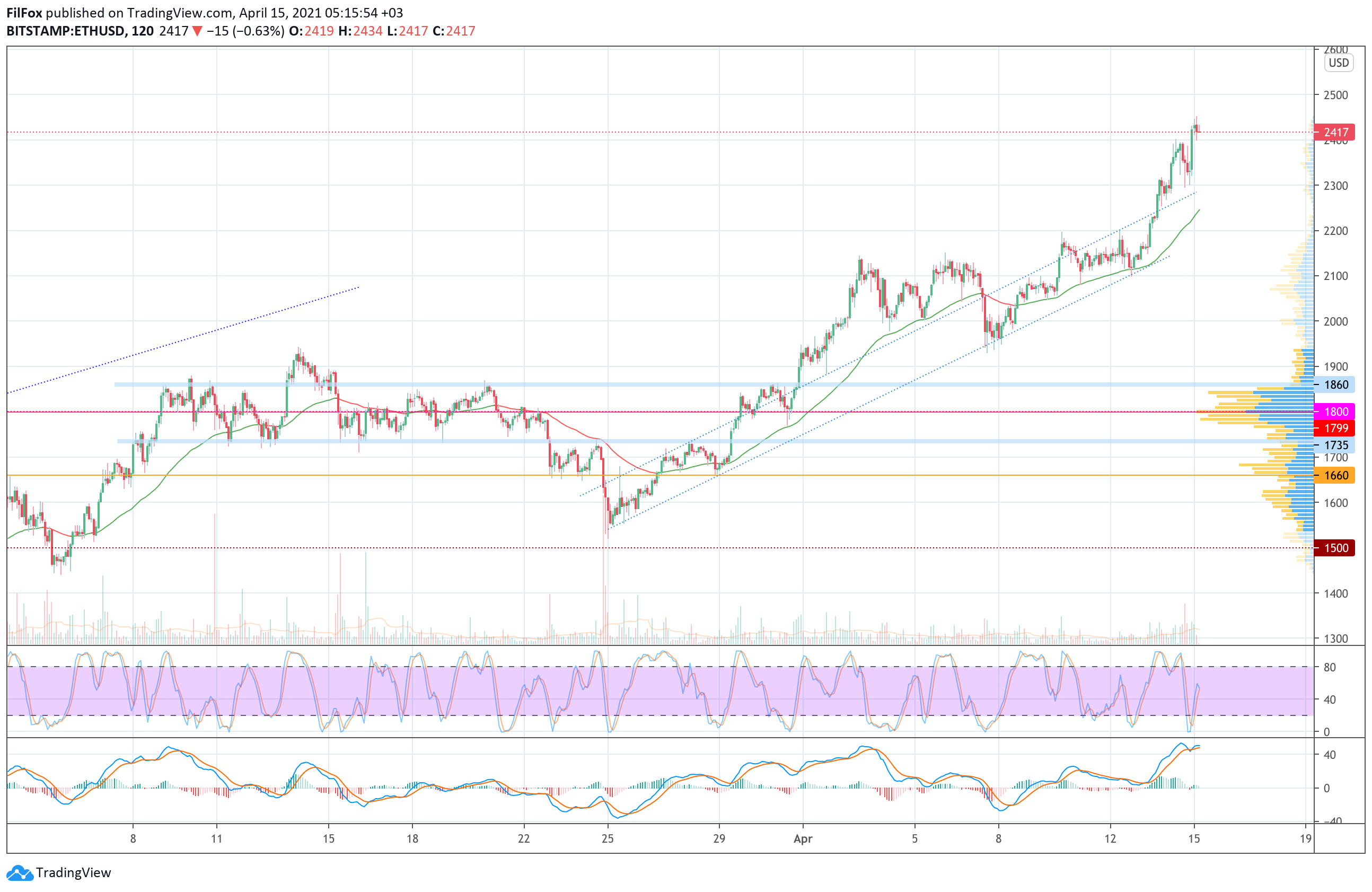 Вчера утром быки легко смогли протестировать уровень 2400.00 USD, установив максимум в точке 2402.50 USD. Во второй половине дня медвежий импульс откатил цену к поддержке 2300.00 USD, но поздно ночью покупатели добились восстановления пары, и на сегодняшнее утро обновили абсолютный максимум в районе отметки 2452.00 USD.