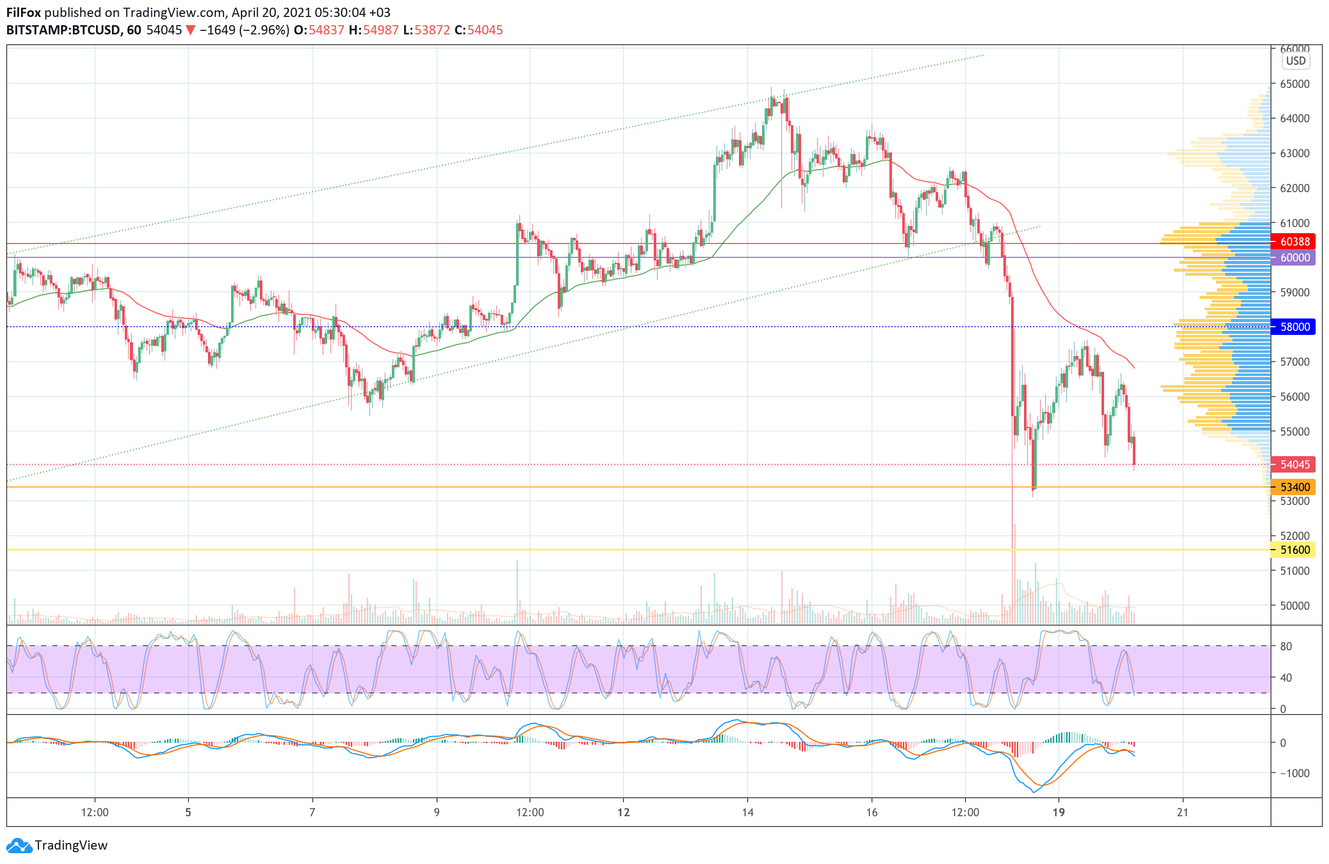 Вчера утром цена BTC не смогла восстановиться выше сопротивления 58000.00 USD. В районе часовой EMA55 пара развернулась на снижение и сегодня утром достигнет оранжевой поддержки 53400.00 USD.