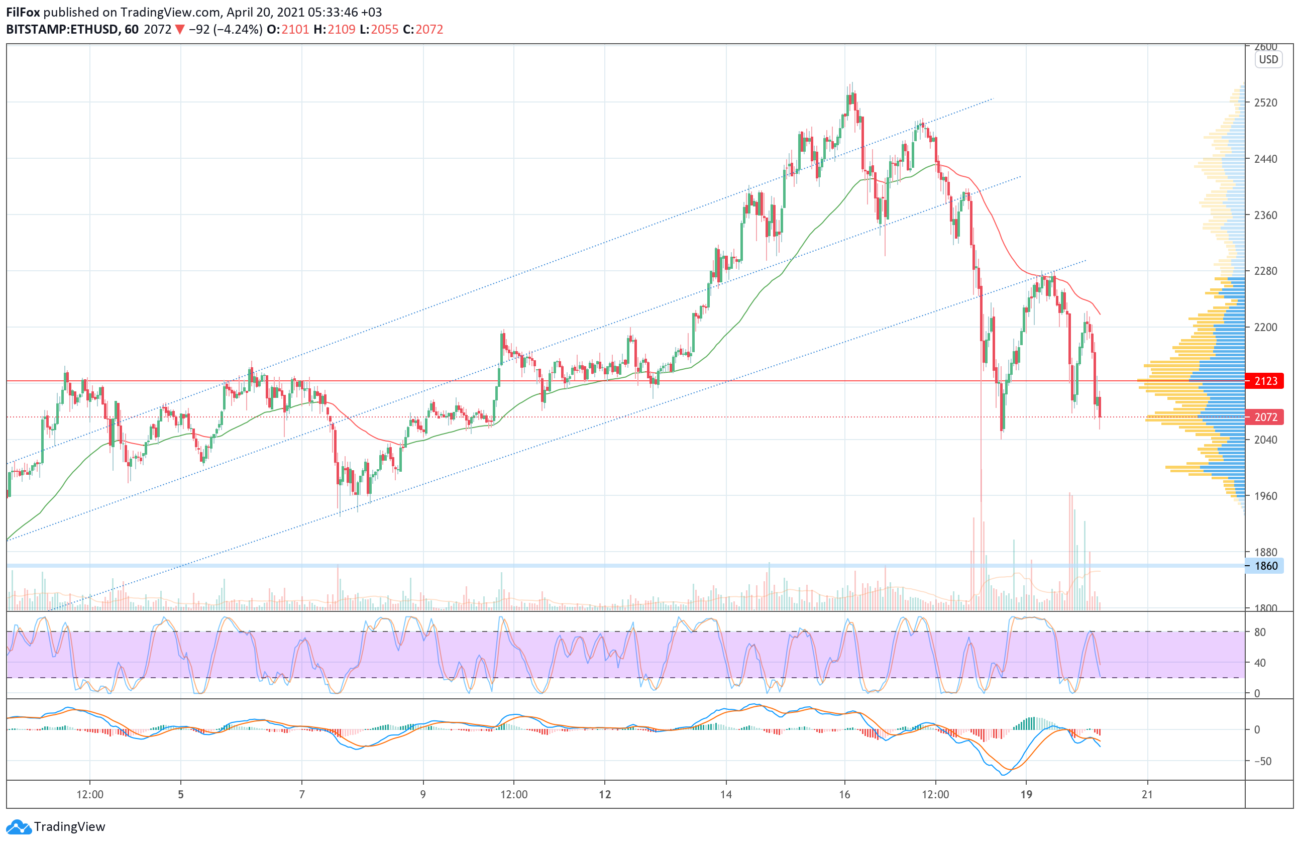 Во второй половине дня давление продавцов усилилось и на сегодняшнее утро цена Ethereum вернулась в зону недавнего минимума 2050.00 USD. Сегодня снижение замедлится, но до конца дня возможен ре-тест психологического уровня 2000.00 USD.