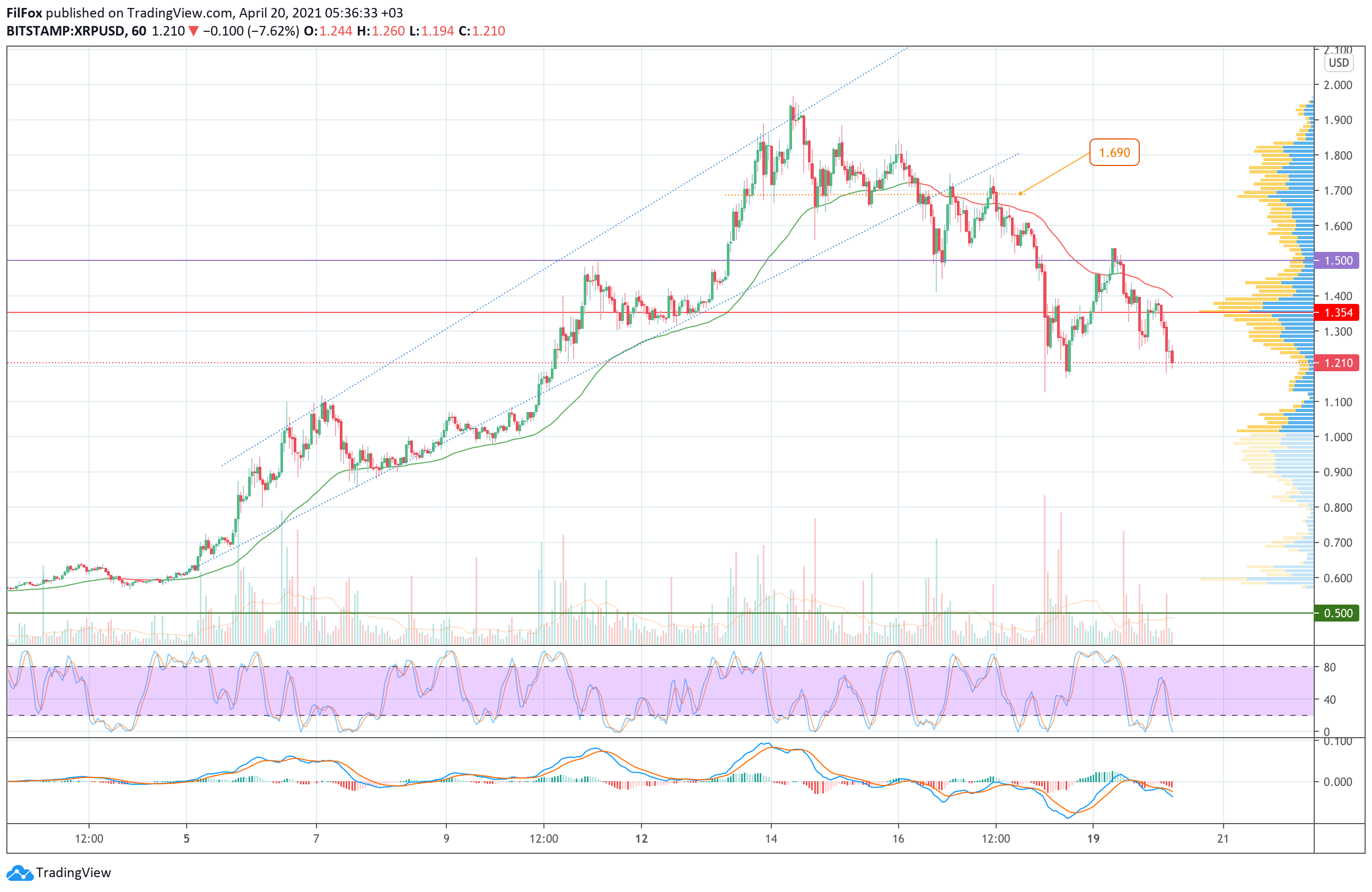 Вчера утром цена XRP продолжила восстановление, но так и не смогла закрепиться выше уровня 1.500 USD. После максимума в точке 1.535 USD продавцы сформировали медвежий импульс, который вернул пару в область минимума прошлой недели.