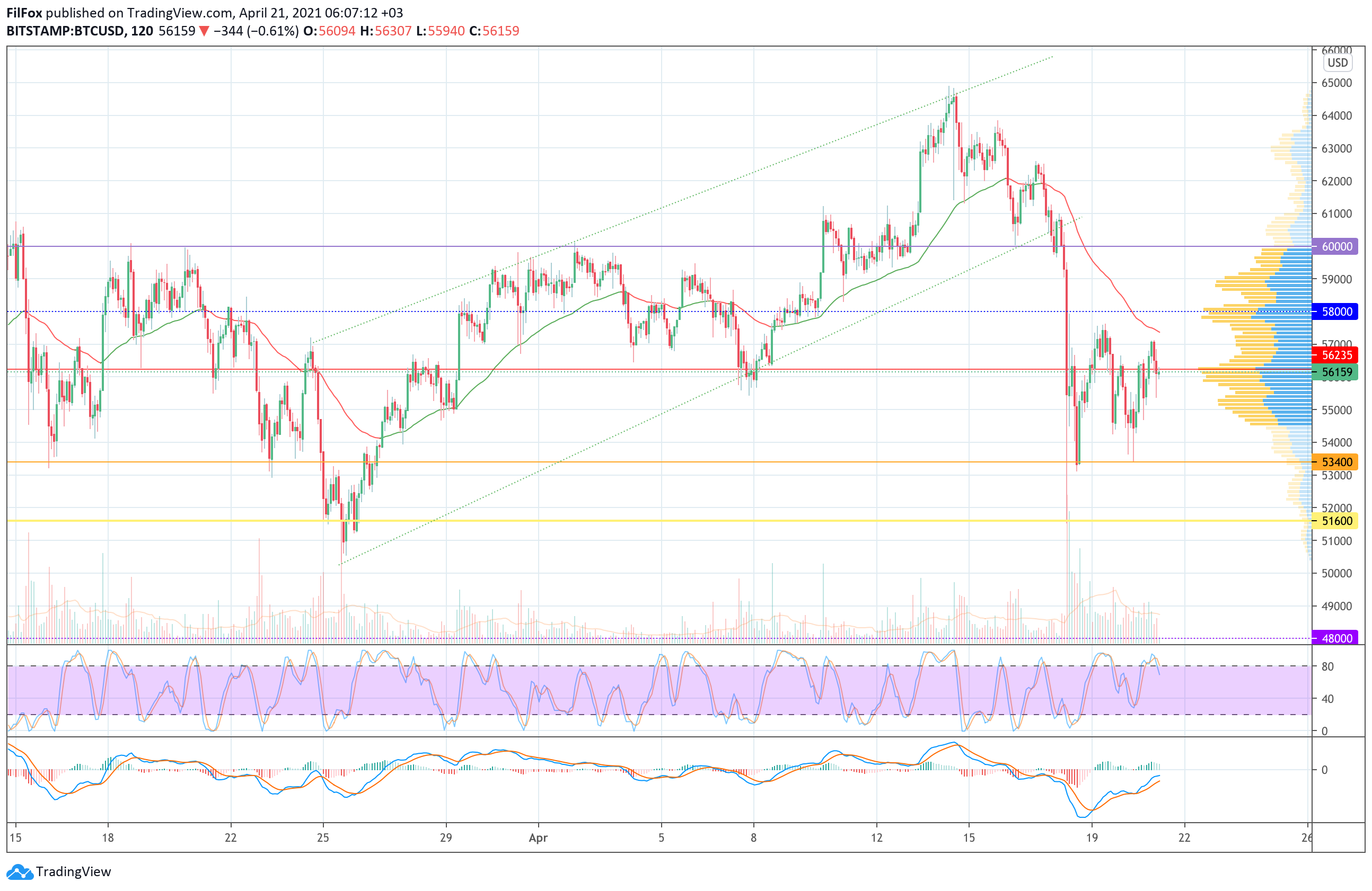 С другой стороны, если цена не сможет удержаться выше двухчасовой скользящей средней EMA55, то снижение к желтой поддержке 51600.00 USD возобновится.