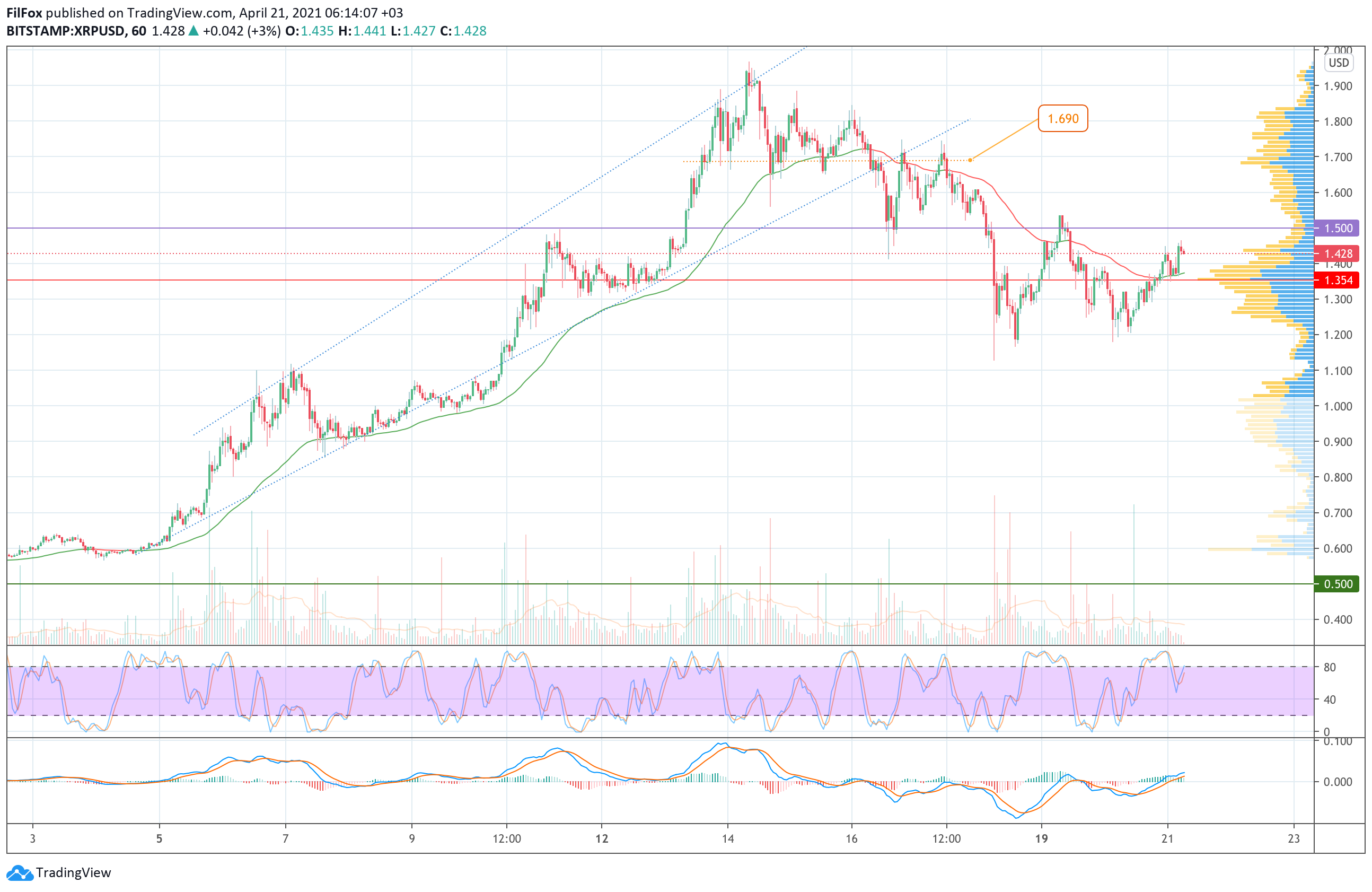 Вчера утром цена XRP нащупала поддержку в районе отметки 1.200 USD и в течение дня закрепилась выше часовой скользящей средней EMA55. Для продолжения роста покупатели должны удержаться выше уровня 1.500 USD.