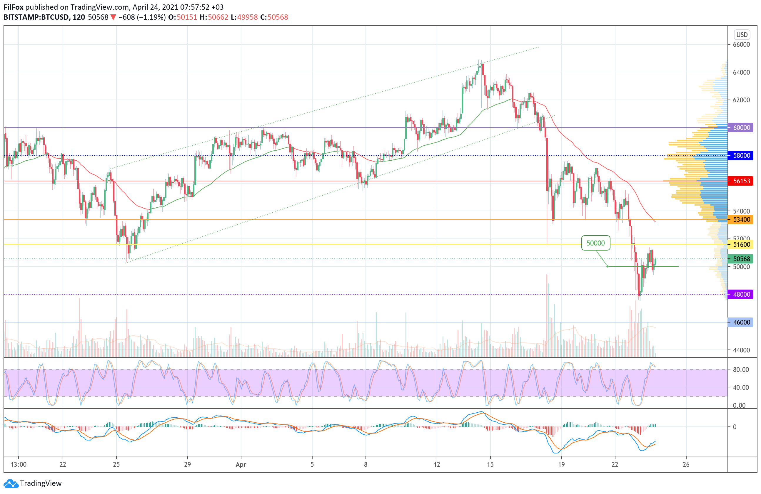 Вместе с этим, на дневном тайм-фрейме индикаторные линии Stoch RSI достигли нулевой отметки в зоне перепроданности. Если быки смогут удержать цену выше пятидесяти тысяч долларов, то возможна краткосрочная консолидация в боковом диапазоне, при этом цена биткоина может восстановиться в область желтой поддержки 51600.00 USD.