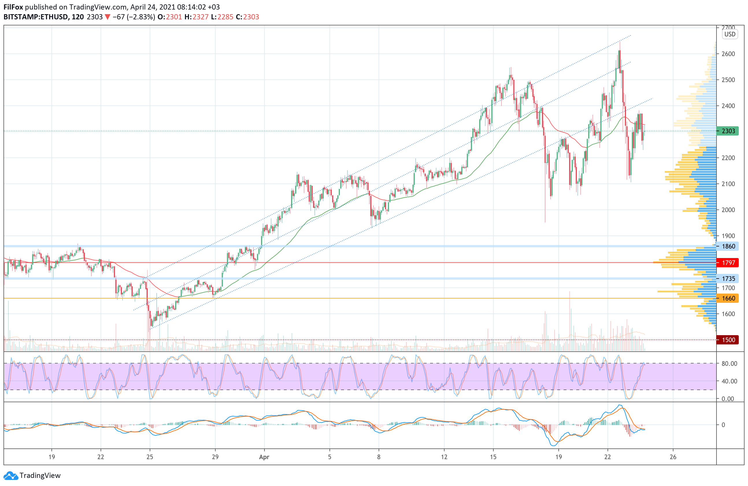 Во второй половине этой недели цена Ethereum смогла нащупать поддержку у нижней границы восходящего канала и в четверг попыталась протестировать его верхнюю границу. Однако, ночью продавцы вернули пару к нижней линии тренда и сильным медвежьим импульсом пробили уровень средних цен, установив дневной минимум в районе поддержки 2100.00 USD.