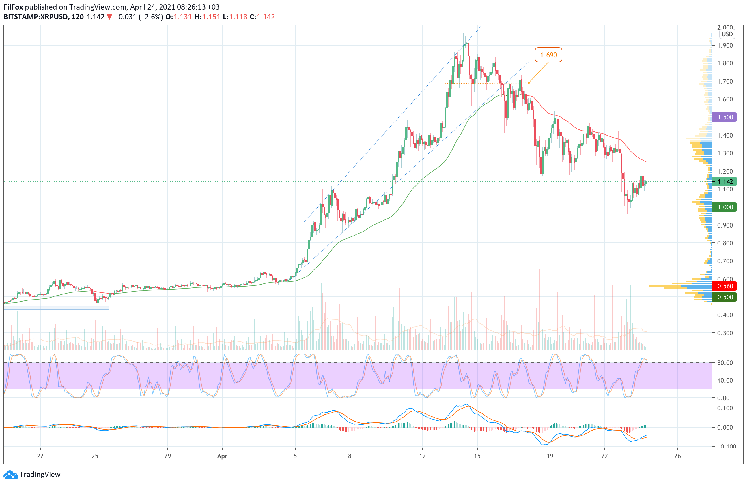 Наш прогноз по снижению пары к психологическому уровню 1.00 USD за монету полностью оправдался. Цена XRP проколола эту поддержку, установив недельный минимум в точке 0.915 USD.
