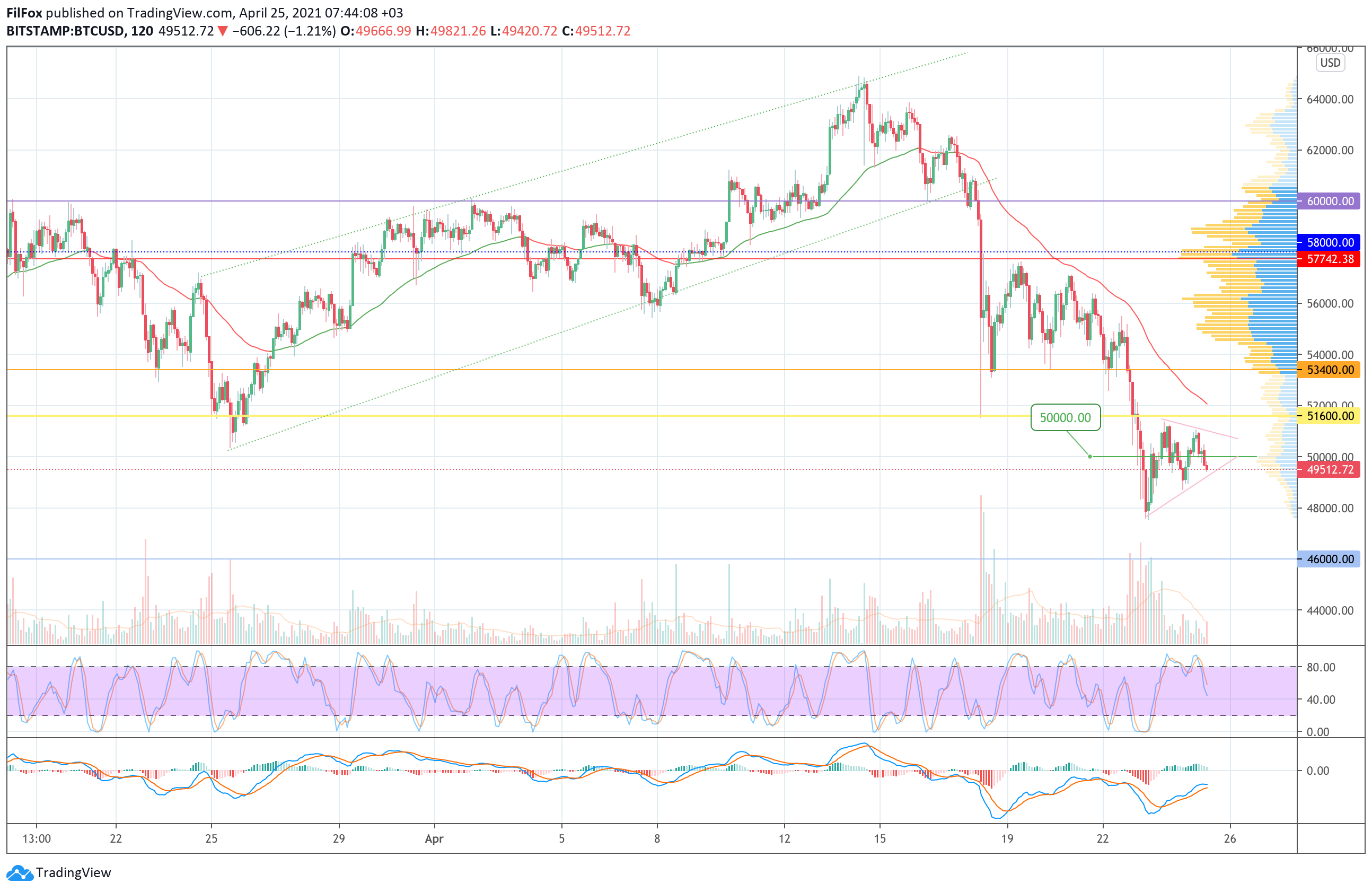 Следует учитывать, что такой прорыв может оказаться ложным, тогда отскок от голубой поддержки будет достаточно высоким и цена BTC закрепится выше психологической отметки 50000.00 USD.