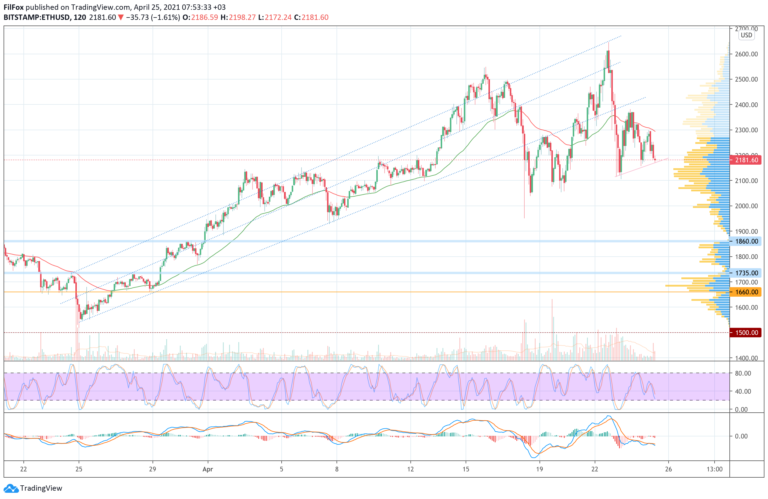 Цена Ethereum не смогла вчера утром преодолеть сопротивление двухчасовой EMA55 и продолжила краткосрочную консолидацию в сужающемся диапазоне с восходящей розовой поддержкой.