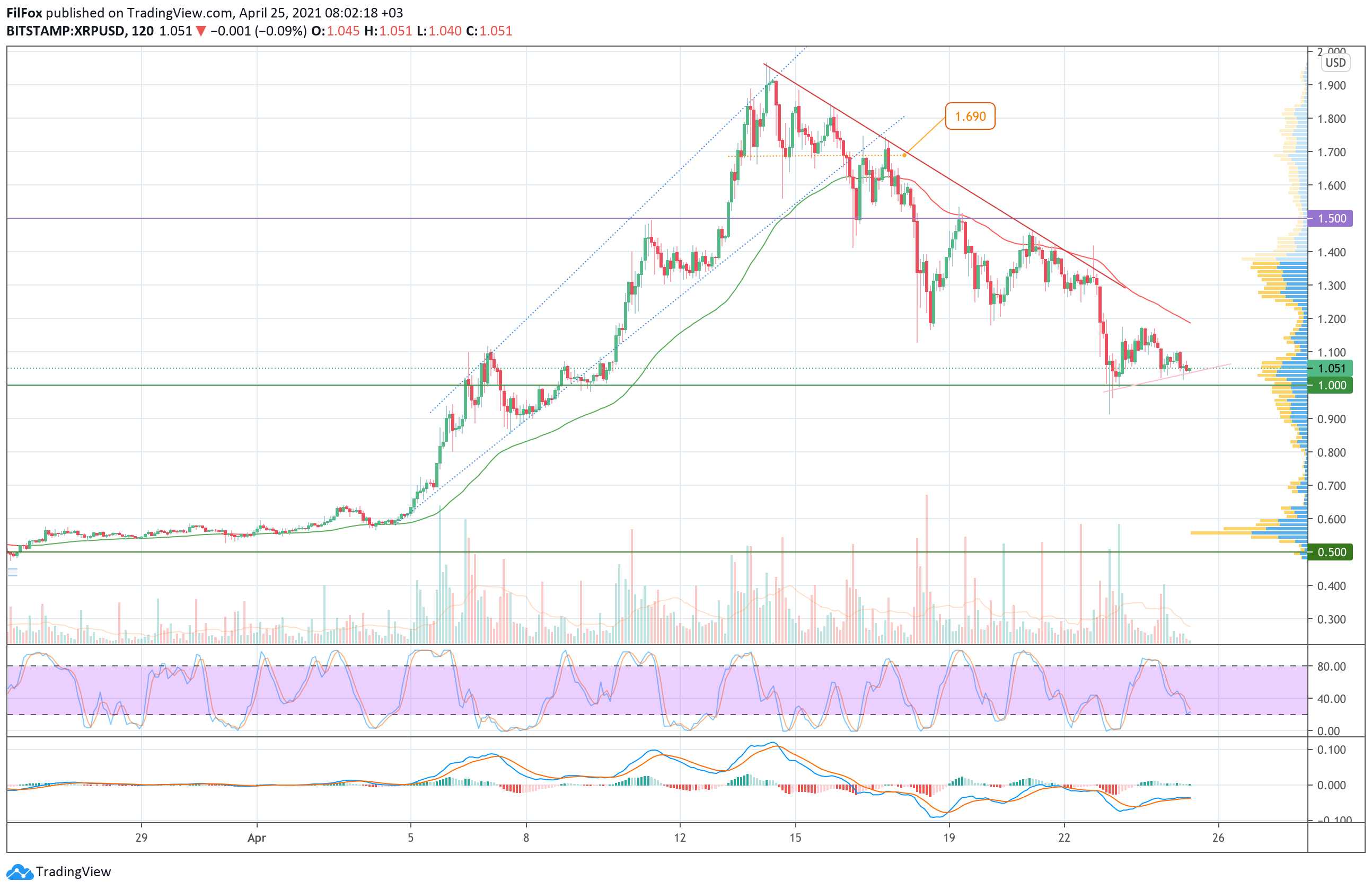 Объёмы торгов существенно сократились и в ближайшее время низкая волатильность цены XRP сохранится. Если медведи продавят нижнюю розовую поддержку, то пара откатится в район отметки 0.900 USD.