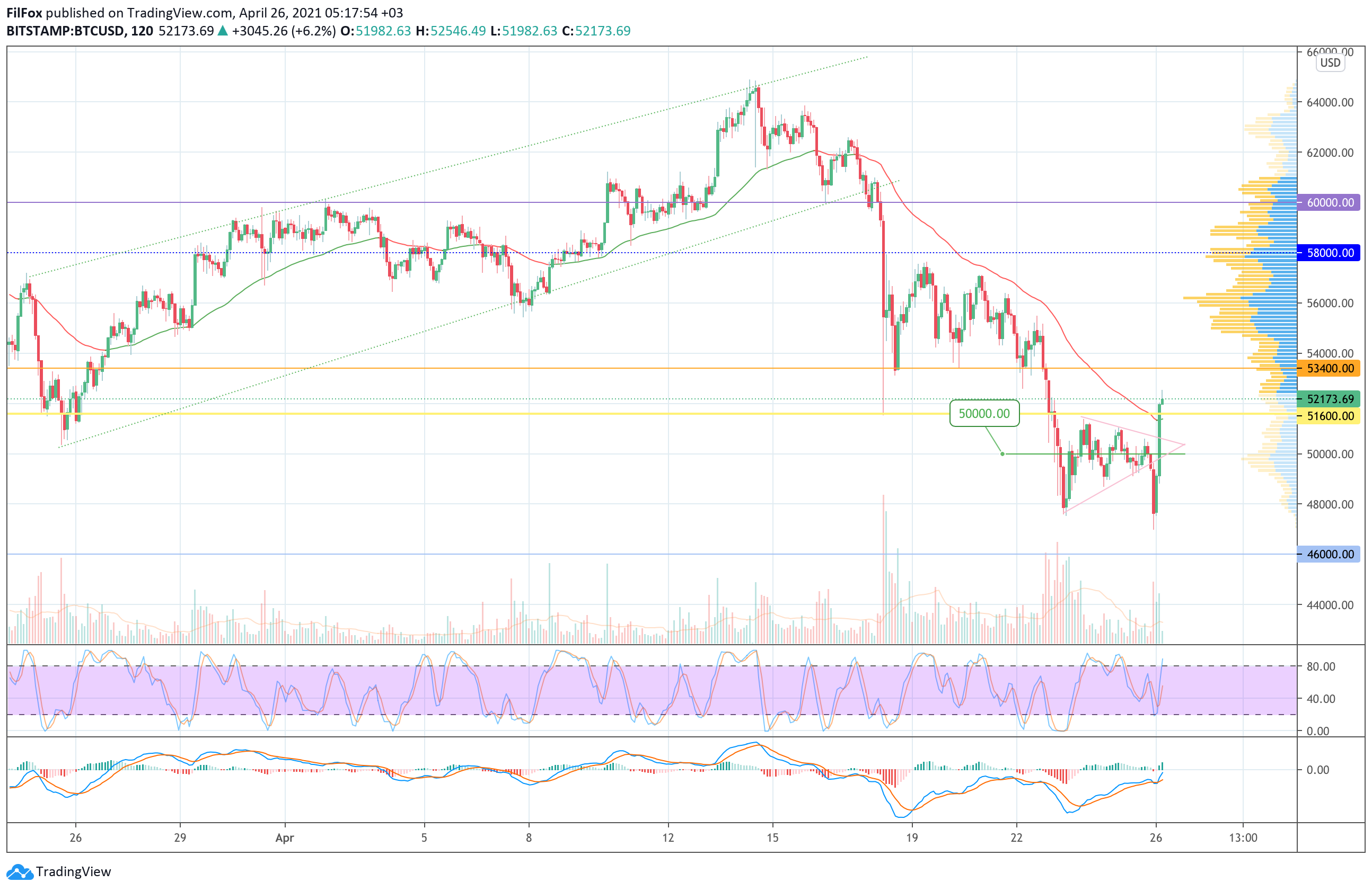 Сегодня ночью цена отскочила от точки минимума и восстановилась к желтому уровню 51600.00 USD. Если в течение дня пара сможет удержаться выше этого уровня, то восстановление продолжится к оранжевой отметке 53400.00 USD.