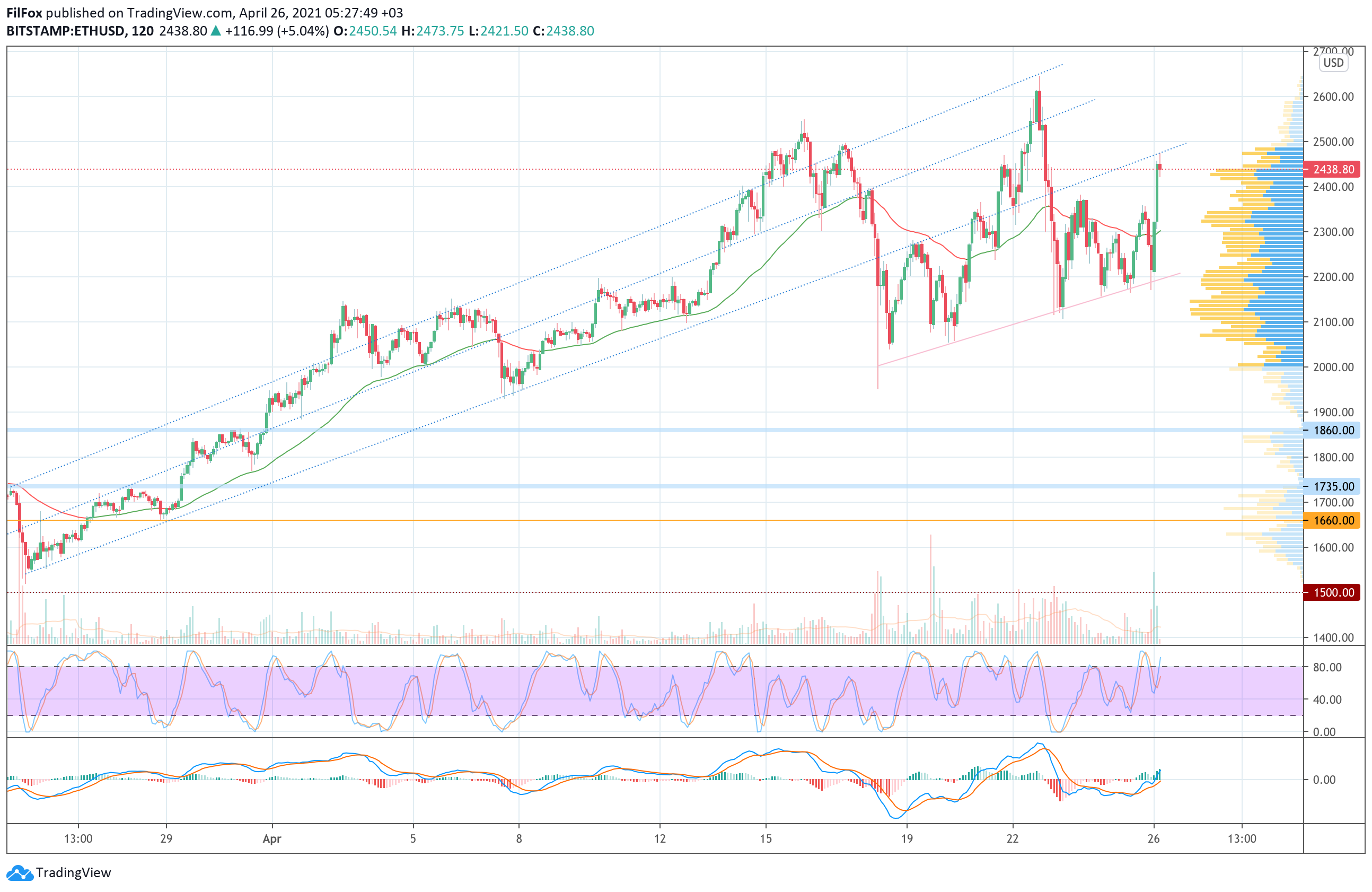 Вчера в первой половине дня цена Ethereum проколола двухчасовую EMA55, но рост не был поддержан крупными объёмами и к концу дня продавцы вернули пару к розовой поддержке.