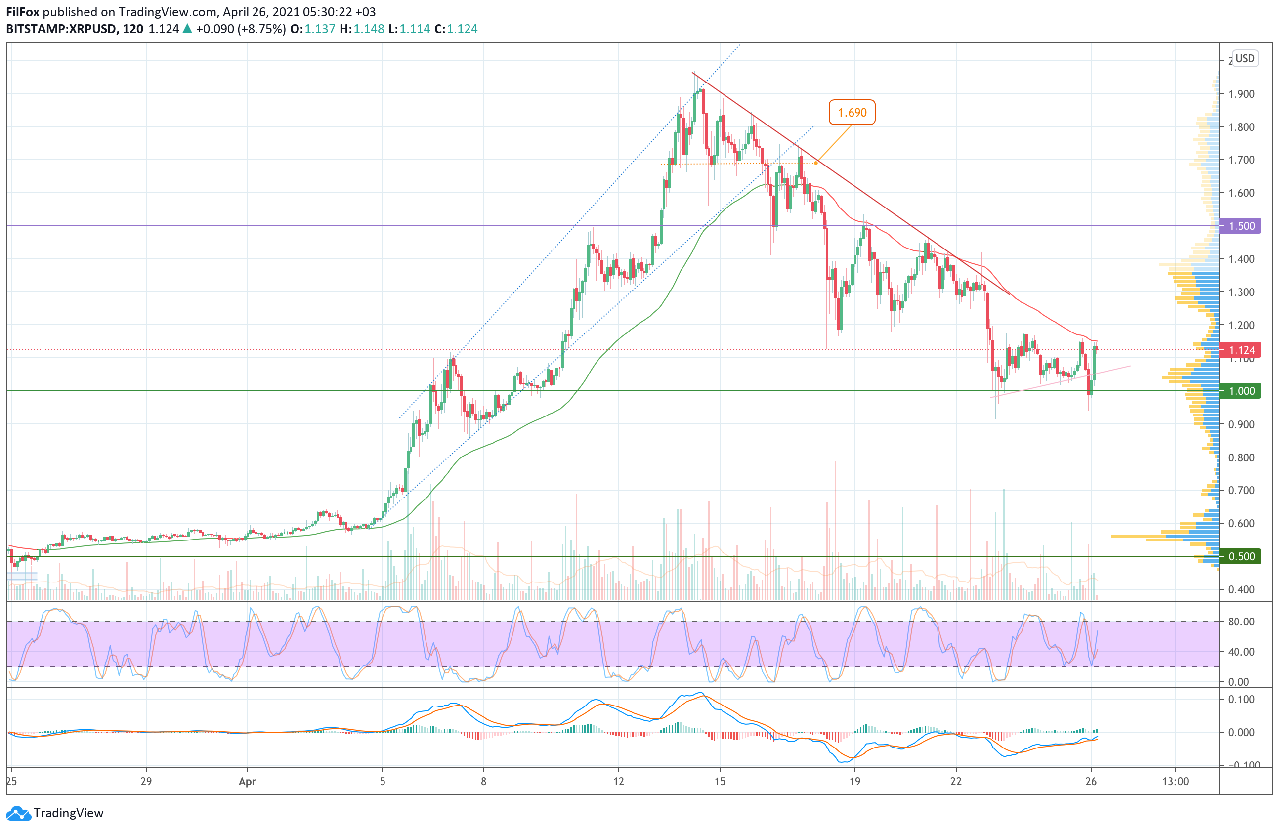 Вчера покупатели попытались восстановить цену XRP в область сопротивления 1.200 USD. Вечером двухчасовая EMA55 развернула пару на снижение и пара в крутом откате пробила розовую поддержку, установив локальный минимум в точке 0.942 USD.