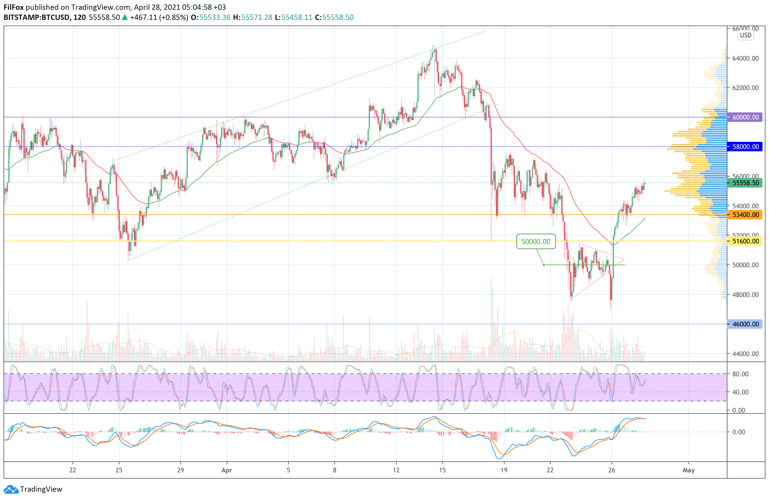 Вчера объёмы покупок превышали средний уровень, и цена BTC восстановилась в область 55800.00 USD.