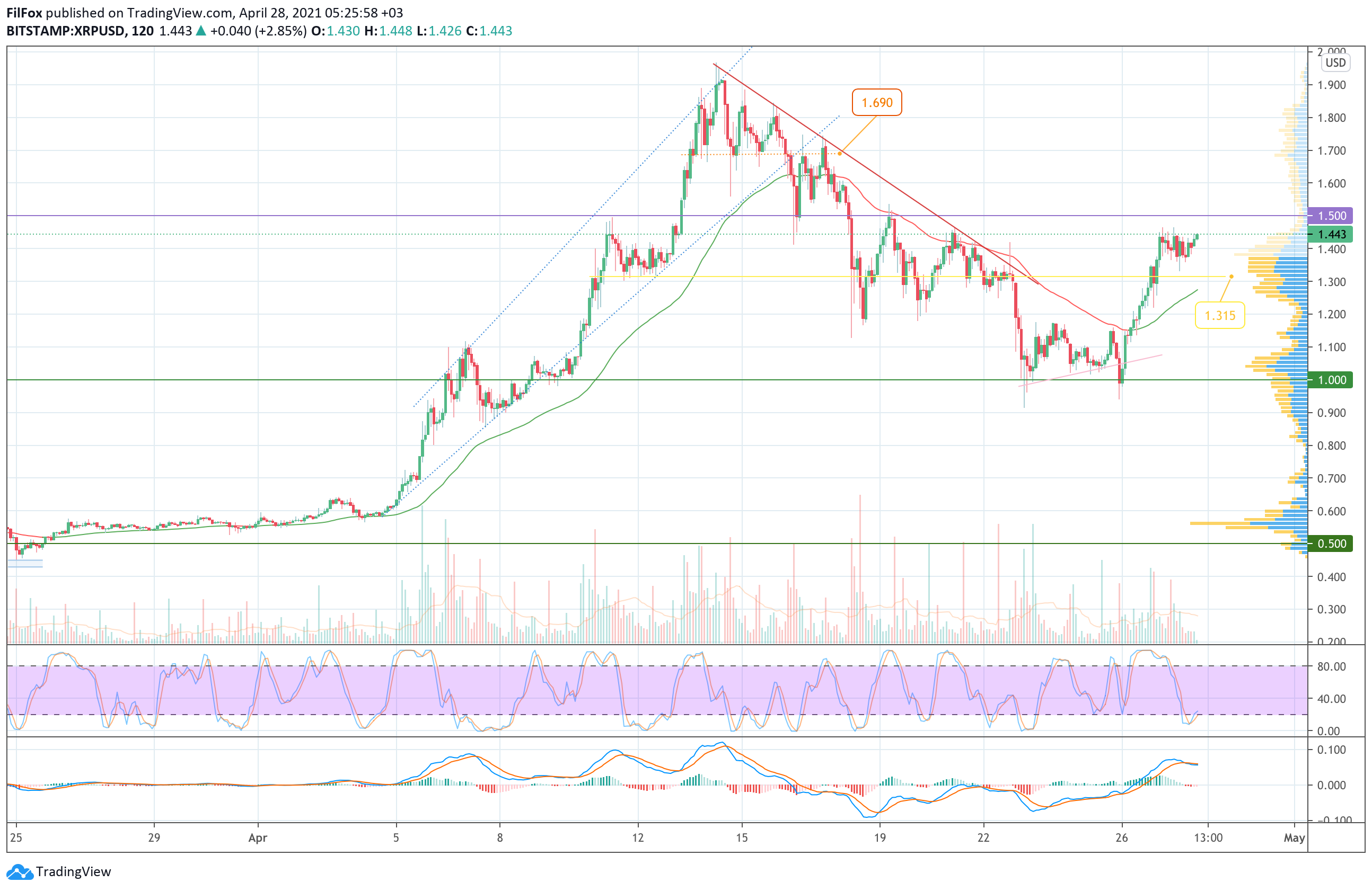 В то время, как цена эфира пробивалась к новым максимумам, пара XRP/USD консолидировалась в боковом диапазоне и не смогла вчера протестировать сопротивление 1.500 USD. На текущий момент объёмы торгов сократились ниже среднего уровня и волатильность цены достаточно низкая.