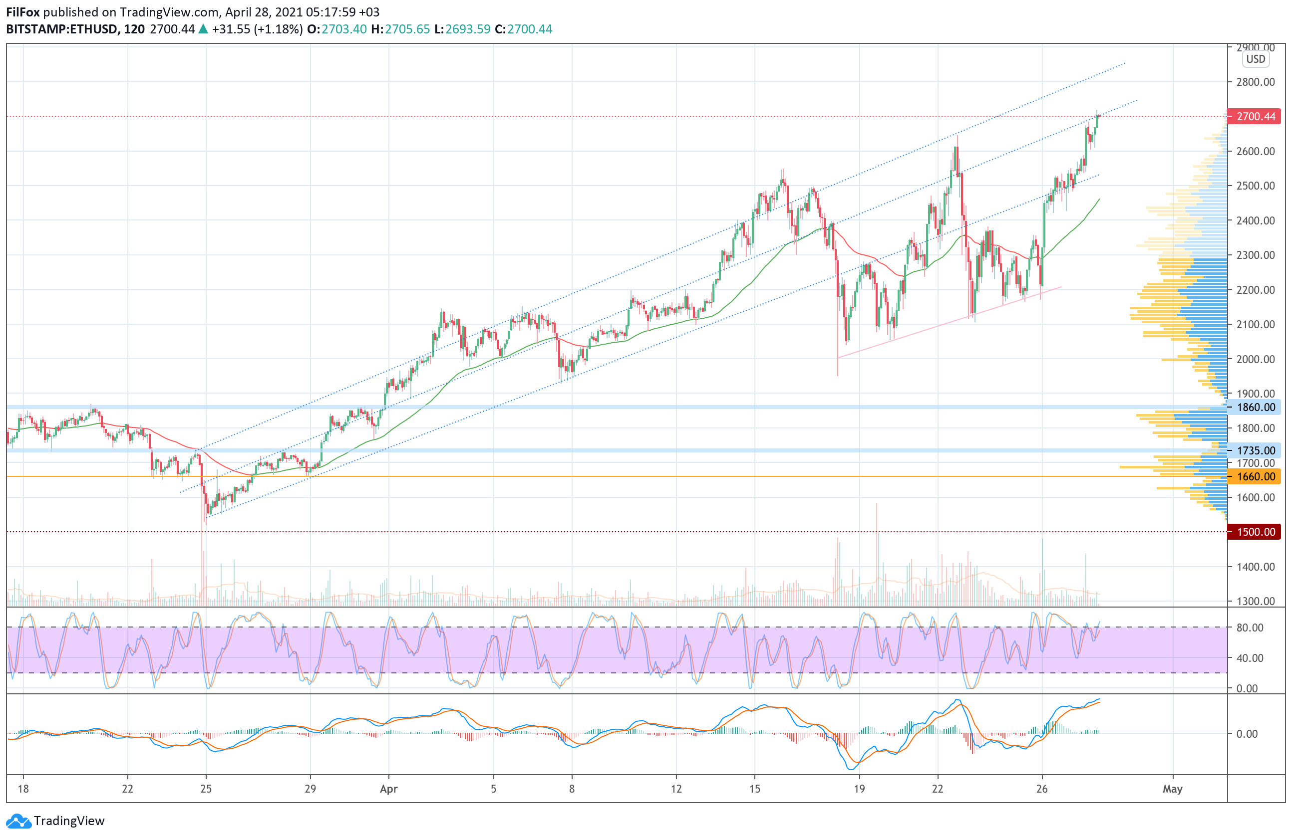 Вчера в первой половине дня цена ETH удерживалась в восходящем канале, а вечером достаточно мощный бычий импульс заставил пару протестировать среднюю линию широкого коридора. После небольшого ночного отката, мы имеем повторный ре-тест средней трендовой линии и новый абсолютный максимум Ethereum в точке 2719.47 USD.