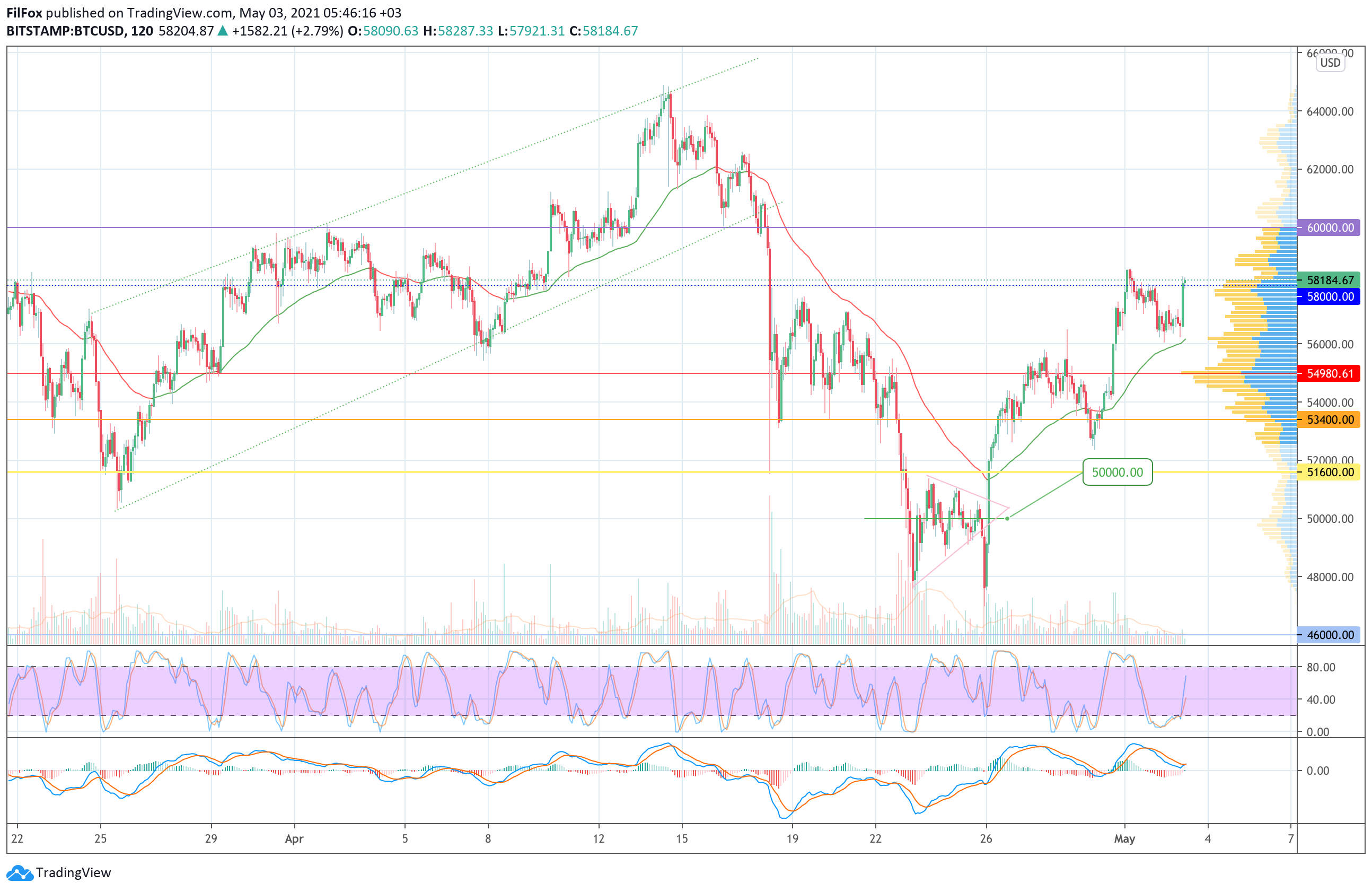 Сегодня утром пара вернулась на прежний уровень 58000.00 USD, и в начале этой недели Bitcoin может продолжить восстановление к психологической отметке 60000.00 USD.
