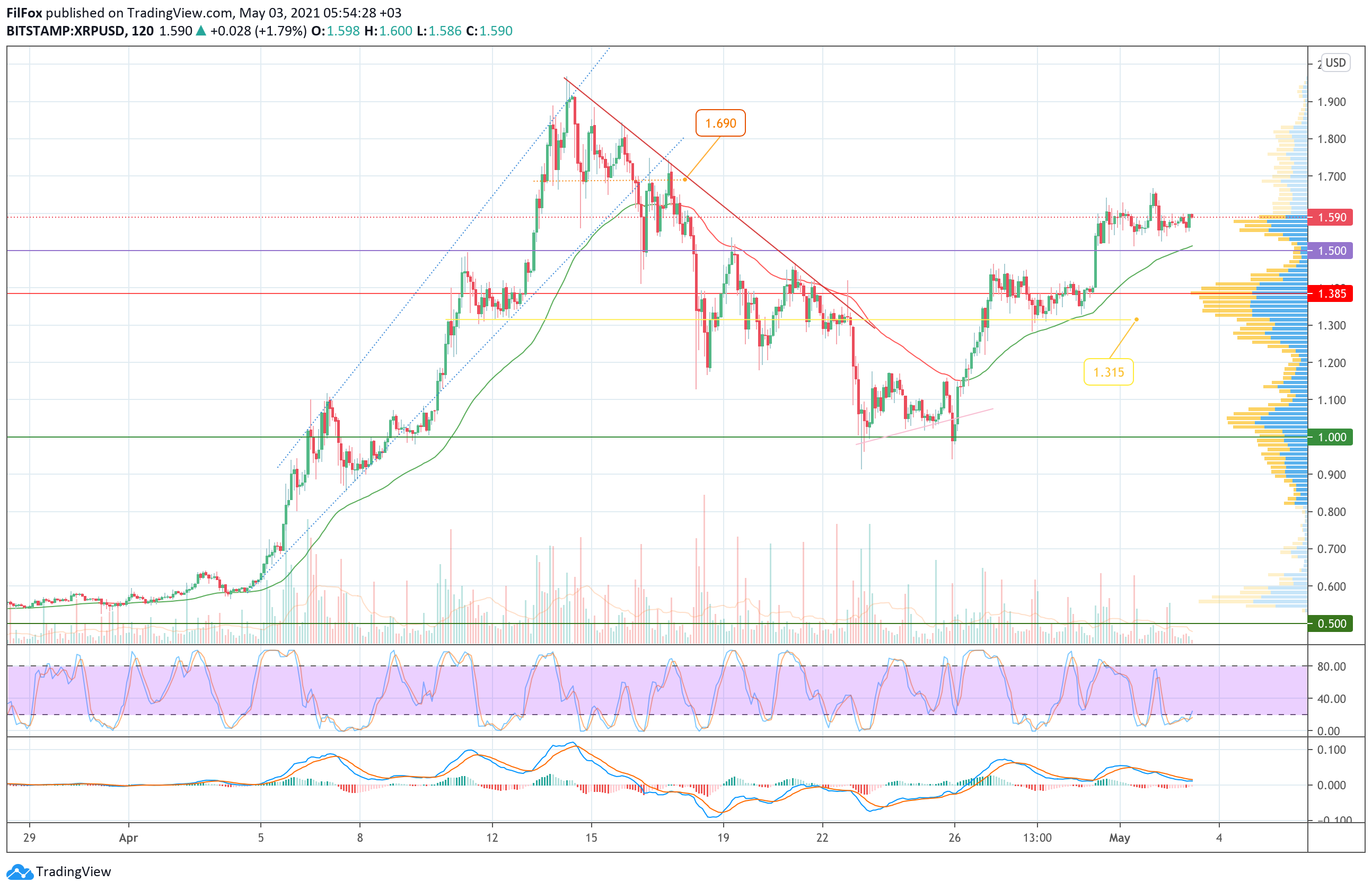 В конце минувшей недели цена XRP застряла в боковом диапазоне с поддержкой на уровне 1.540 USD. Сегодня ночью у покупателей была слабая попытка вырваться из бокового коридора, но рост не был поддержан крупными объёмами и пара вернулась к поддержке 1.540 USD.