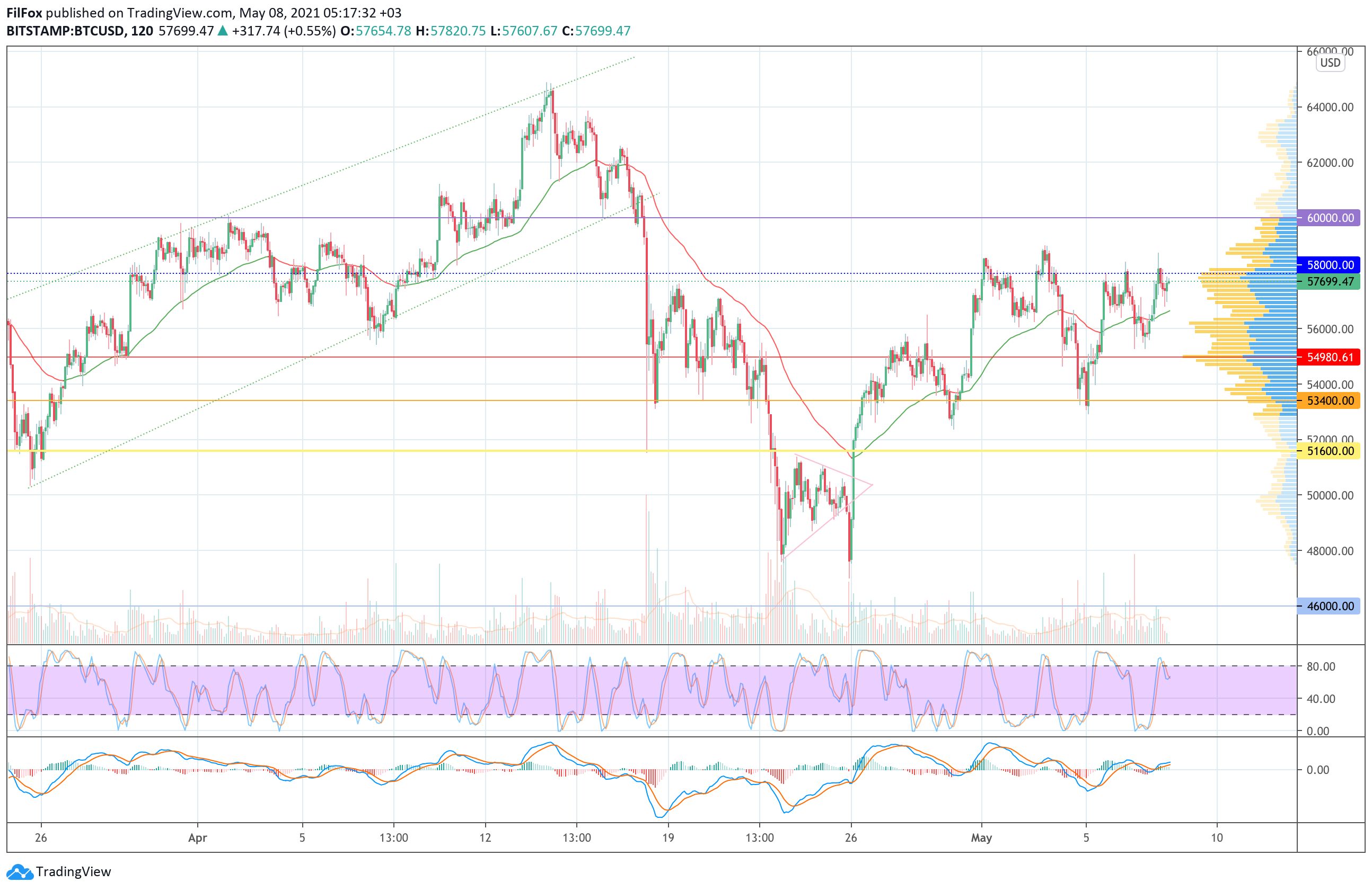 Сегодня утром покупатели опять пытаются пробиться выше сопротивления 58000.00 USD. На этот раз быки могут добраться до целевой отметки 60000.00 USD и до конца недели будут пытаться удержать цену в районе отметки 61000.00 USD.