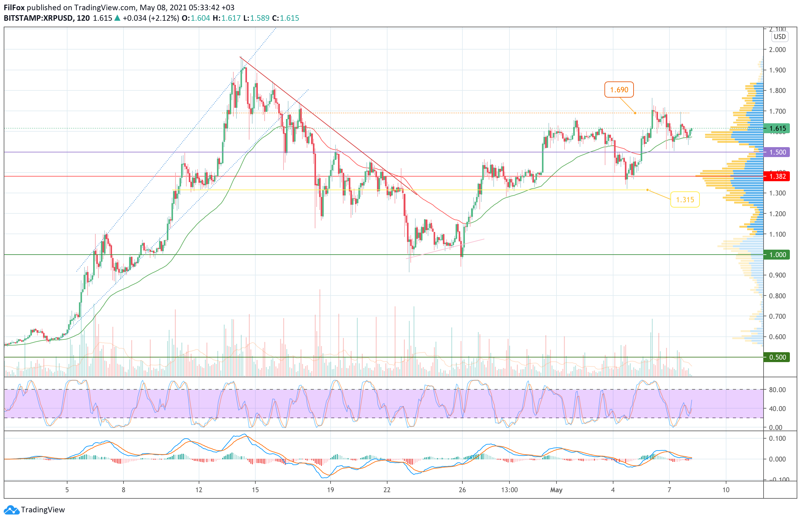 Вчера в первой половине дня медведи пытались прорвать мощную поддержку 1.500 USD, но пара отскочила выше двухчасовой EMA55 и покупателям удалось реализовать очередную атаку на сопротивление 1.690 USD. В течение дня цена XRP не смогла проколоть оранжевый уровень сопротивления и консолидировалась в области скользящей средней EMA55.