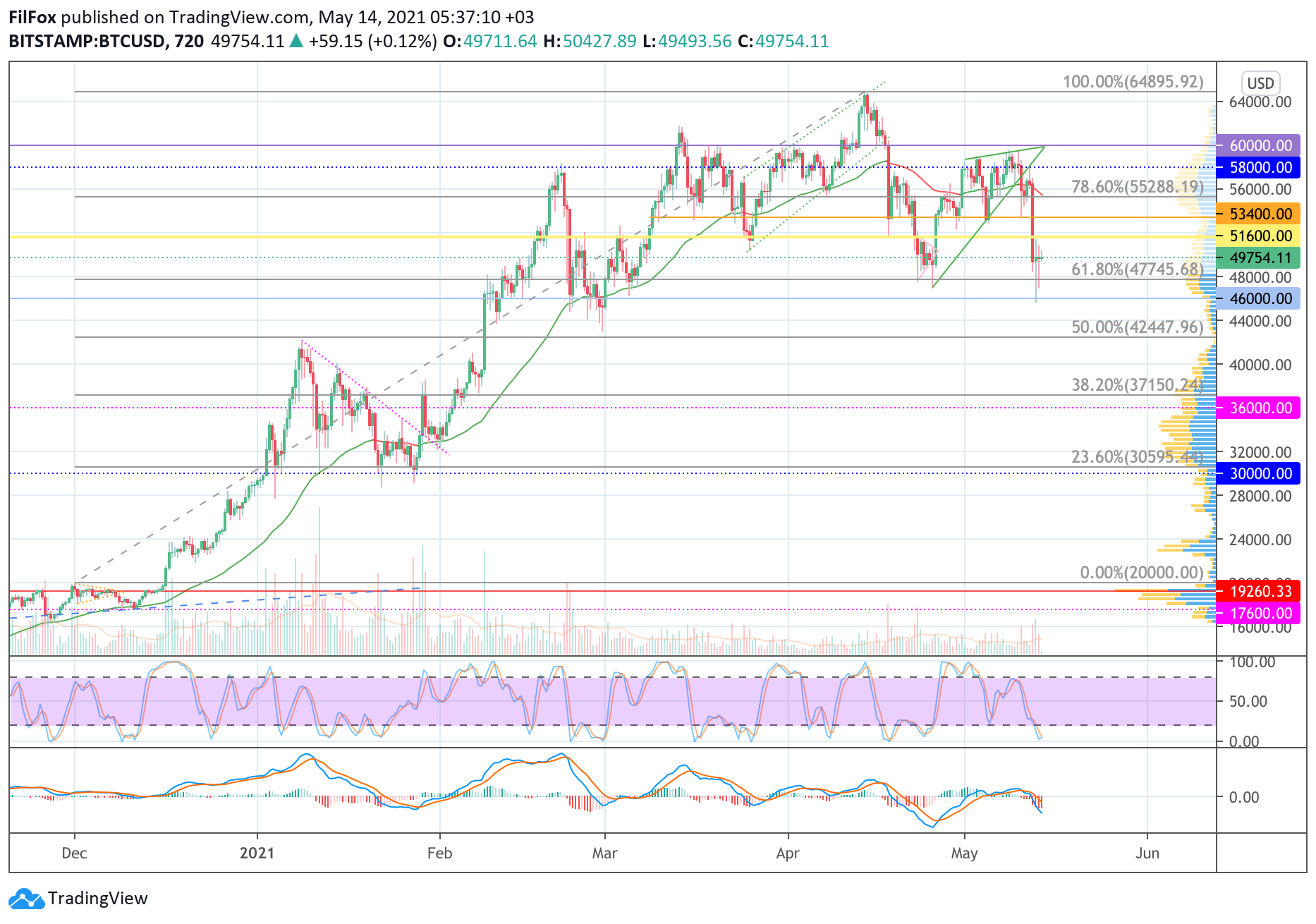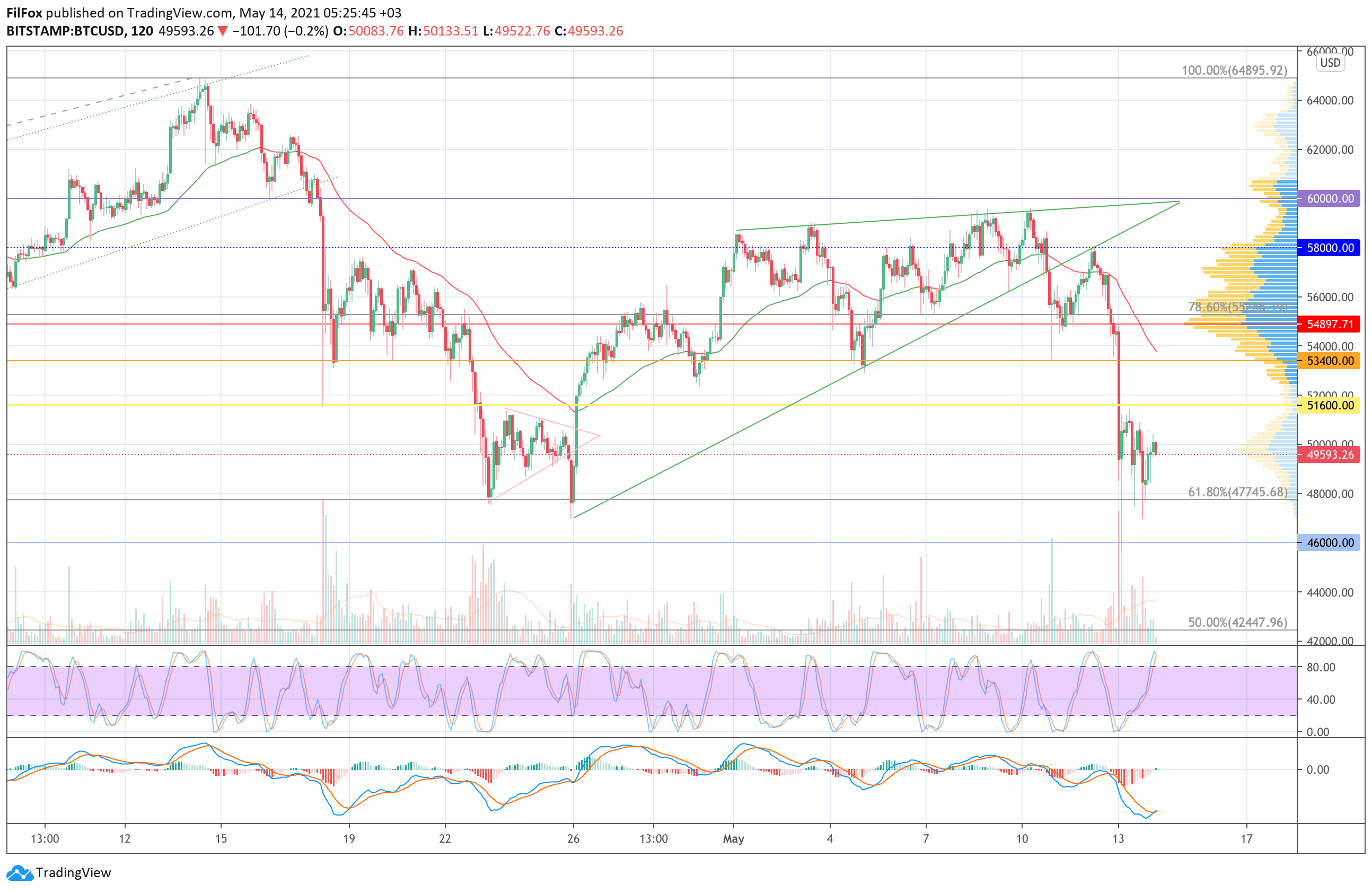 Вчера цена BTC не смогла удержаться выше 50000.00 USD и постепенно снижалась в зону недельного минимума. Давление продавцов ограничивалось уровнем 61.8% фибоначчи (47745.68 USD). Уровни фибоначчи построили исходя из максимума в точке 64895.92 USD, установленного 14 апреля, а за нулевой уровень принята психологическая отметка 20000.00 USD.