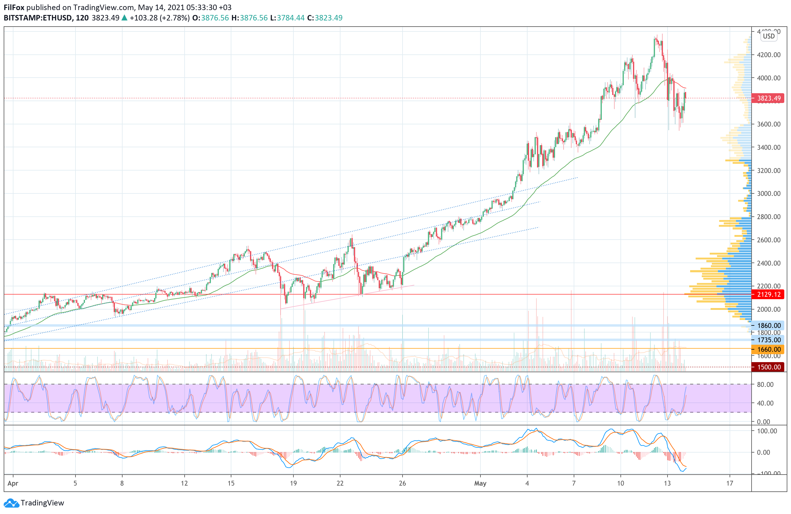 Вчера утром цена Ethereum пыталась удержаться в районе двухчасовой EMA55, но продавцы оттеснили пару к вчерашней поддержке 3600.00 USD. Объёмы продаж превышали средний уровень и медведи прокололи поддержку вплотную приблизившись к отметке 3500.00 USD.