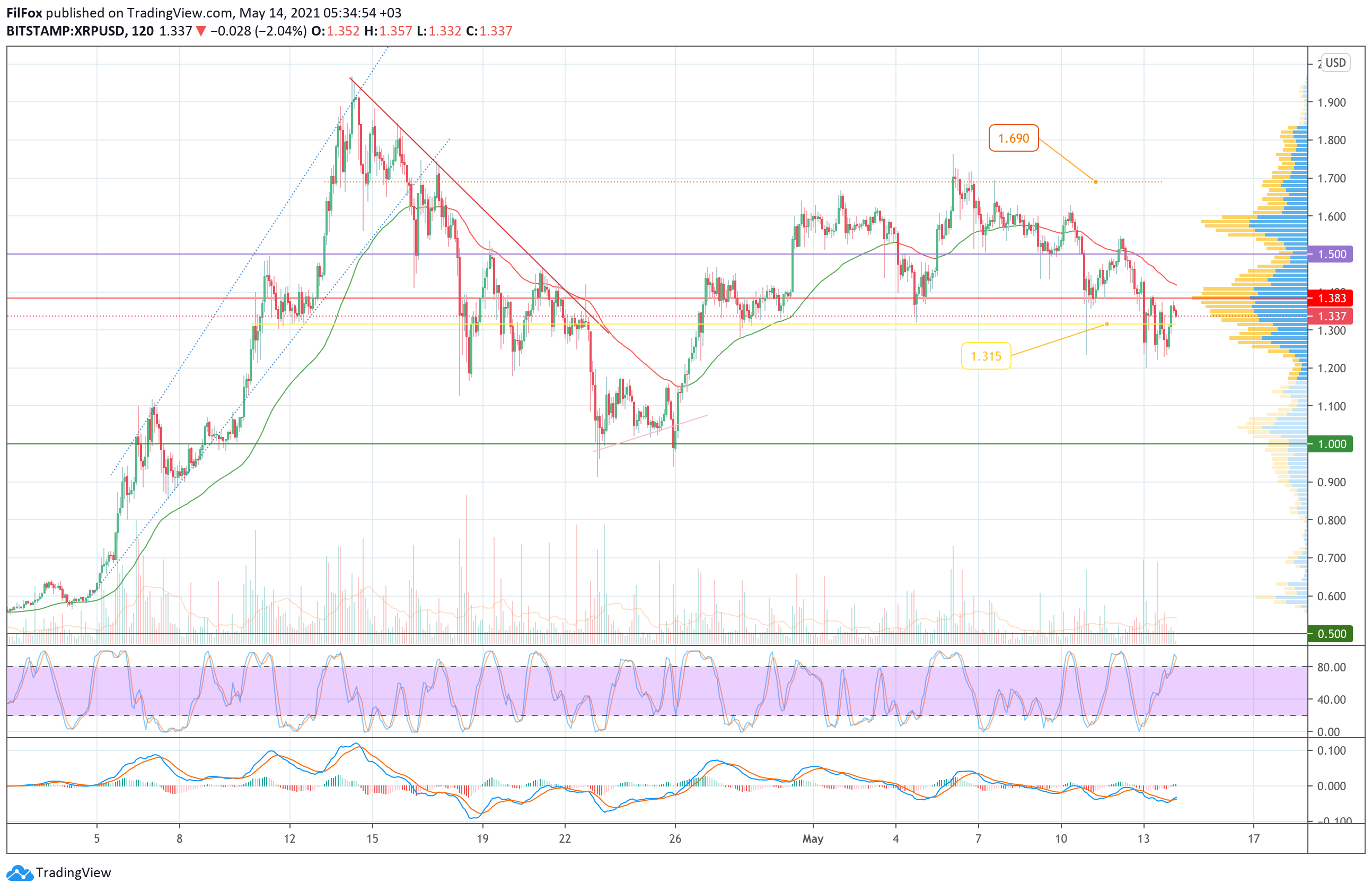Вчера цена XRP отчаянно цеплялась за поддержку на уровне 1.315 USD. Медведи несколько раз оттесняли пару ниже желтого уровня поддержки, но протестировать зону локального минимума так и не удалось.