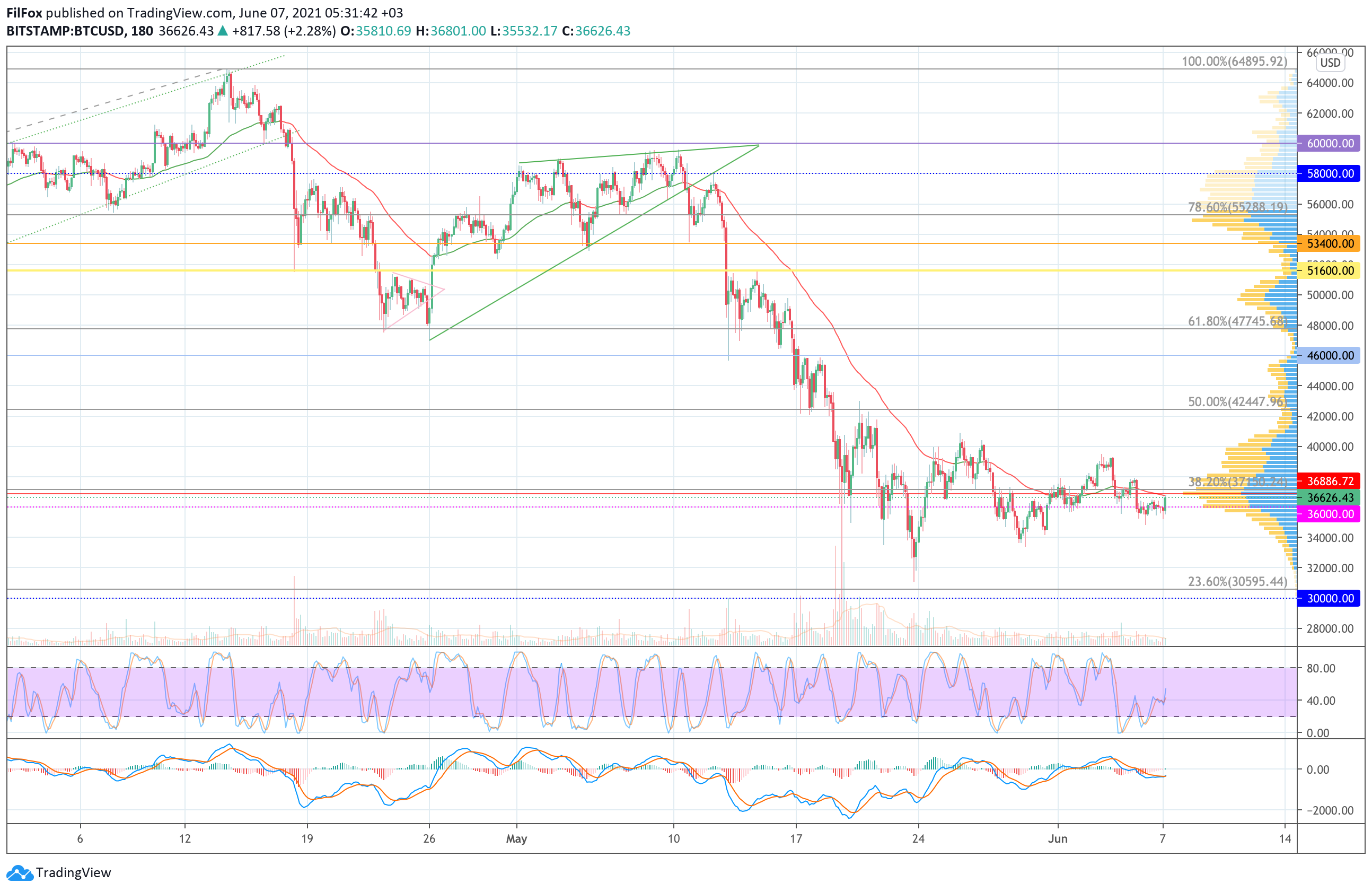 В завершении недели покупатели попытались восстановить цену и закрепиться выше сиреневой поддержки 36000.00 USD. Объёмы покупок были небольшие, однако сегодня ночью пара восстановилась в область средних цен.