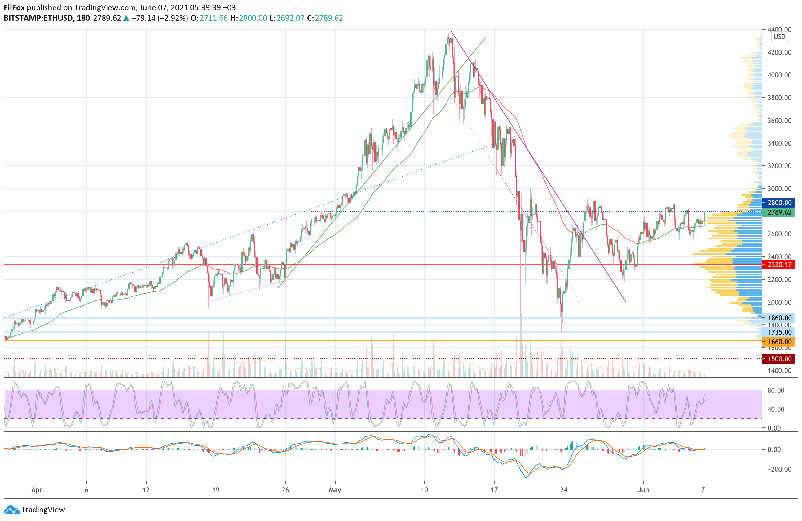 В воскресенье покупатели восстановили цену эфира, а сегодня утром пара опять остановилась на линии сопротивления 2800.00 USD. Есть слабая надежда на ложный бычий прорыв, но скорее всего, медведи усилят натиск и пробьют зону минимума прошлой недели. В начале этой неделе минимум возможен в районе поддержки 2200.00 USD.