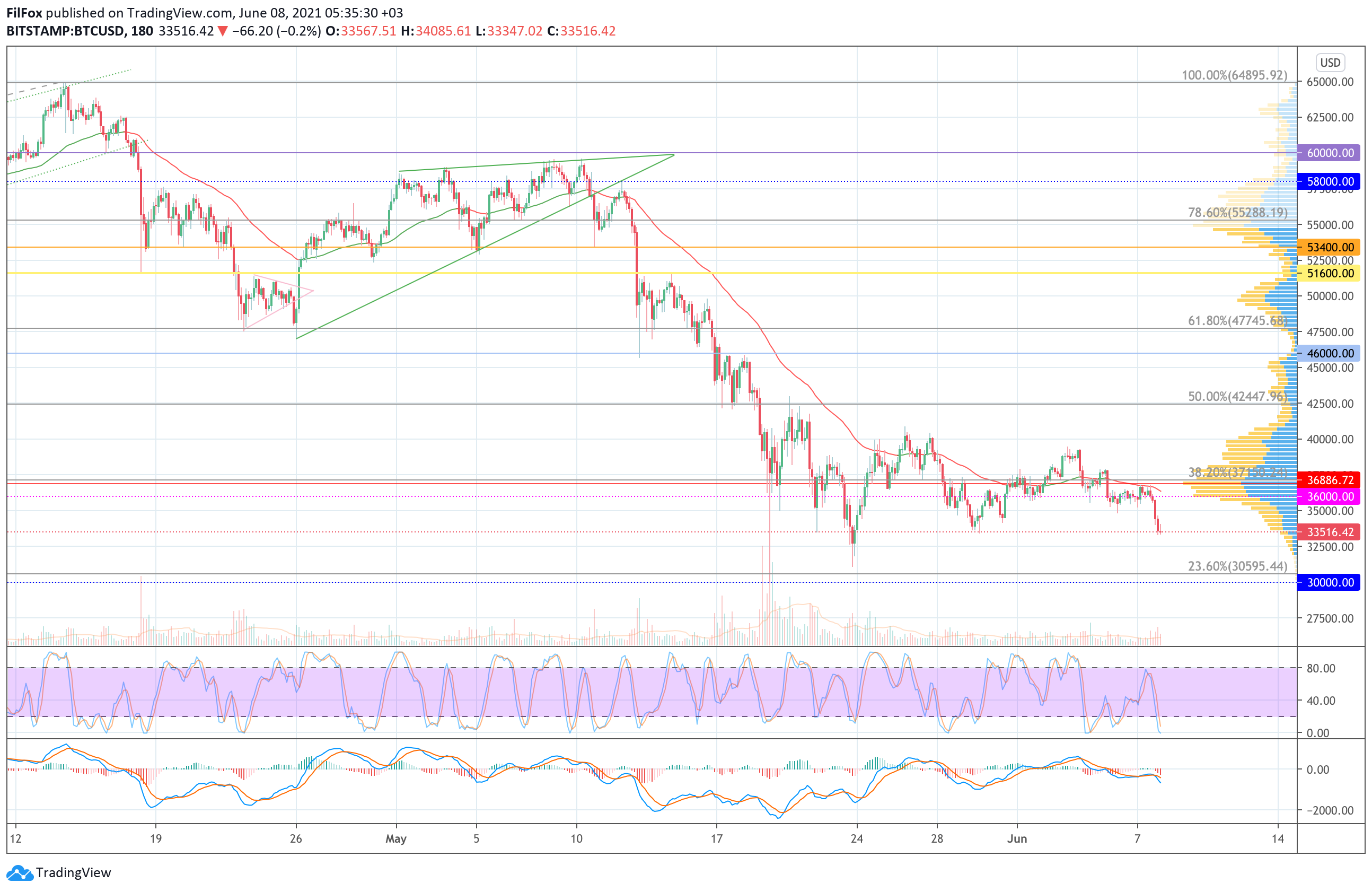 Вчера в первой половине дня покупатели удерживали пару в области средних цен. После обеда объёмы продаж начали увеличиваться и цена откатилась ниже поддержки 36000.00 USD, а в завершении дня медведи прорвали уровень 34000.00 USD.