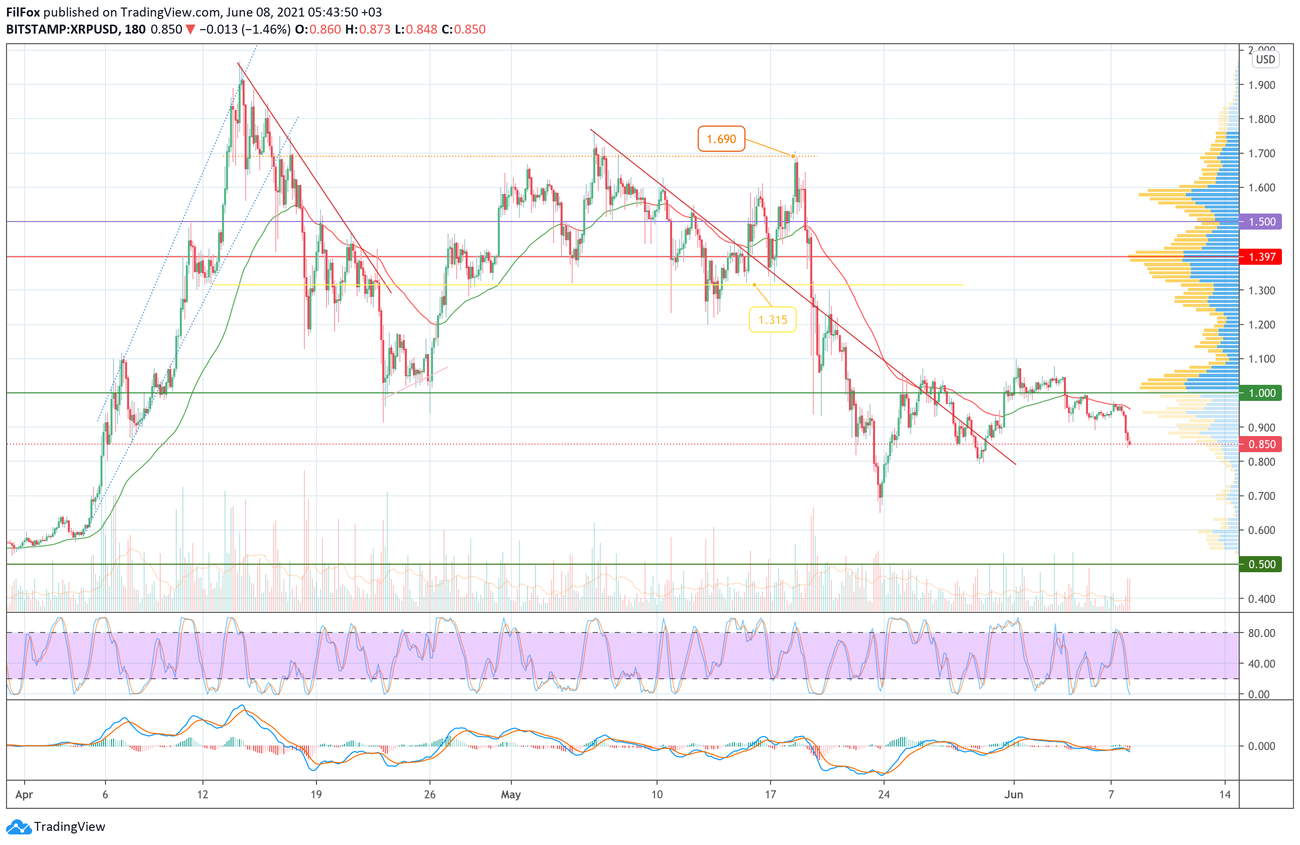 Вчера цена XRP развернулась в районе скользящей средней EMA55 и откатилась ниже отметки 0.850 USD. Сегодня утром пара достигла минимума в точке 0.828 USD, замедлив снижение, однако падение ещё не окончено.