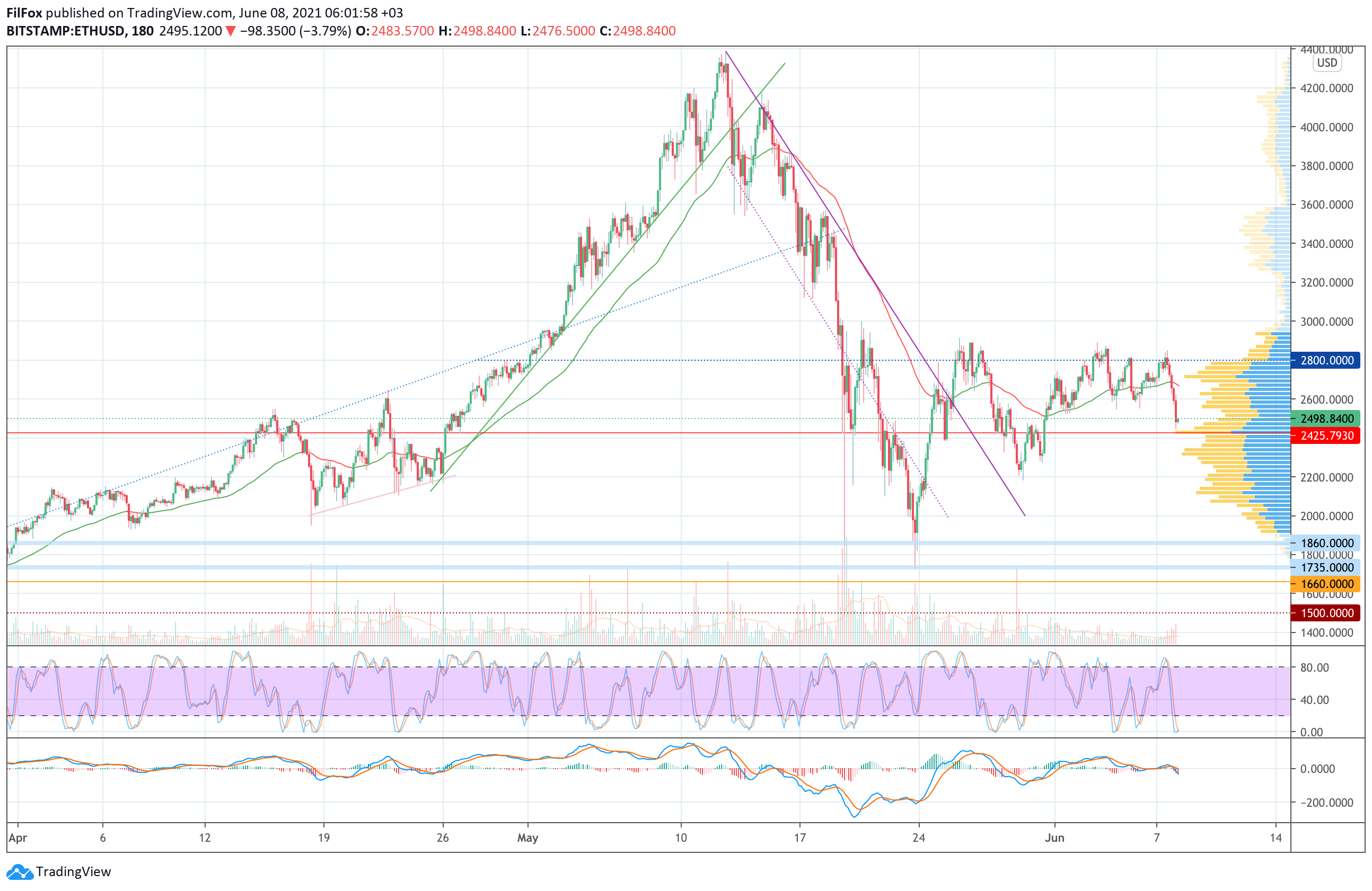 Вчера покупатели не смогли сформировать бычий импульс и пробить сопротивление 2800.00 USD. Во второй половине дня медведи усилили натиск и откатили цену Ethereum ниже трёхчасовой EMA55.